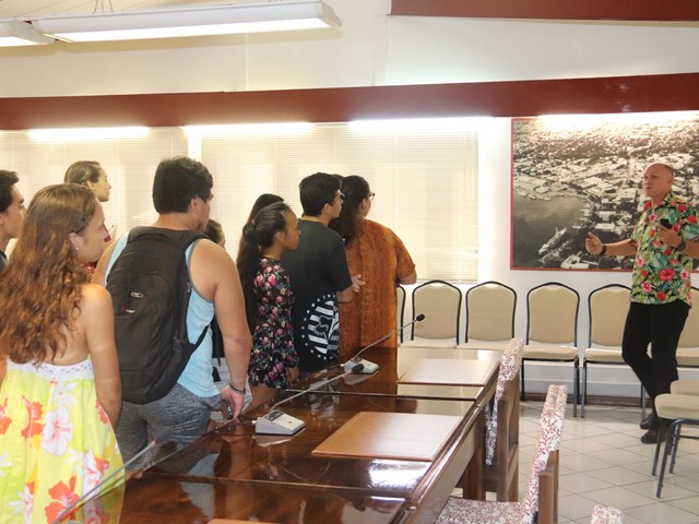 Les élèves et leurs accompagnateurs ont débuté leur visite dans le hall René LEBOUCHER pour ensuite être conduits dans la salle Sonia AGNIERAY-THUNOT, une des salles dédiées aux réunions législatives, avant de visiter l’hémicycle Vetea BAMBRIDGE où se tiennent les séances plénières. Dans ce lieu stratégique de l’institution, ils ont pu rencontrer M. Antonio PEREZ, président de la commission de l’économie, des finances, du budget et de la fonction publique qui leur a fait une brève présentation du projet de loi du pays définissant les modalités d’organisation des bingos. En tant que rapporteur de ce texte, il a pu leur expliquer comment la séance plénière, qui a lieu ce même jour, allait se dérouler. Très interressés par ce qu’ils venaient d’apprendre, les 19 élèves ont ensuite assisté à la deuxième séance de la session budgétaire qui avait lieu juste après leur visite.
