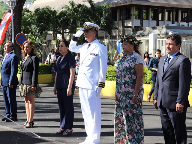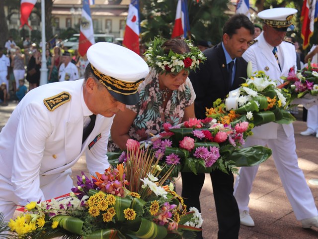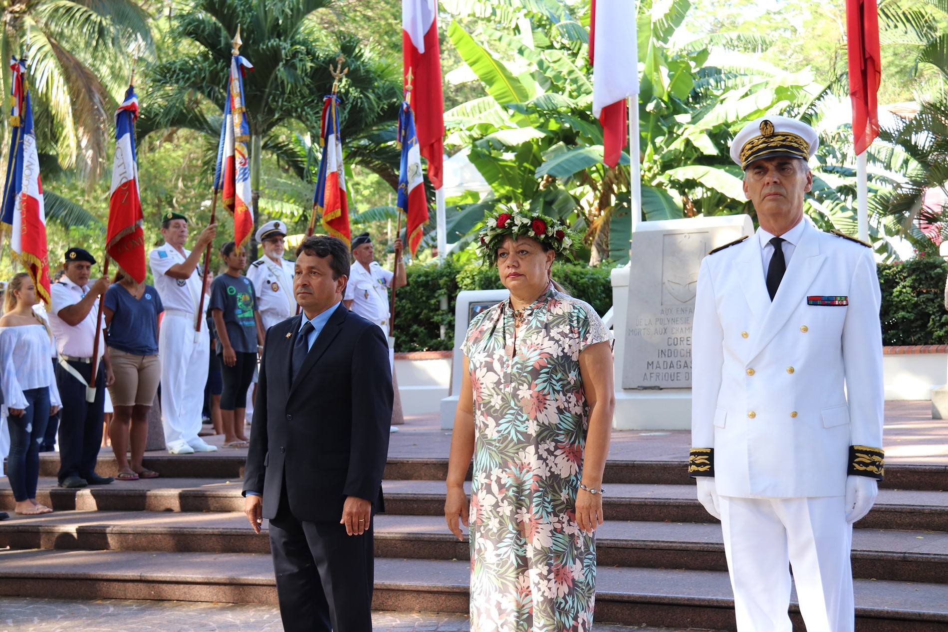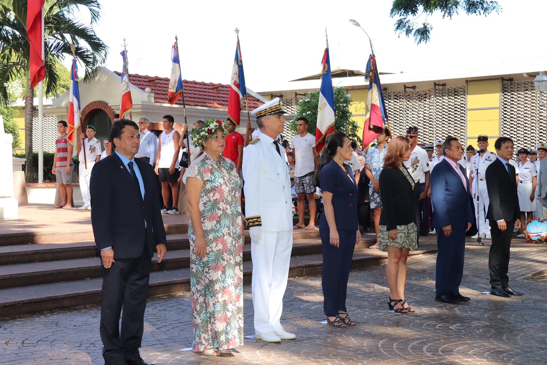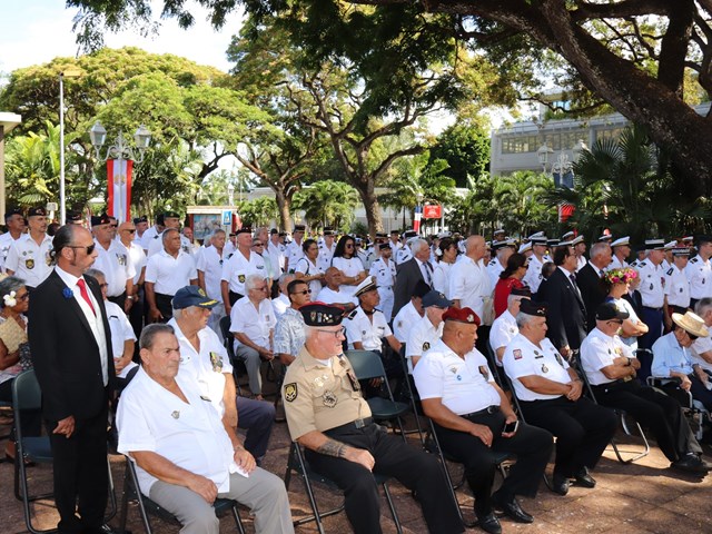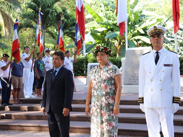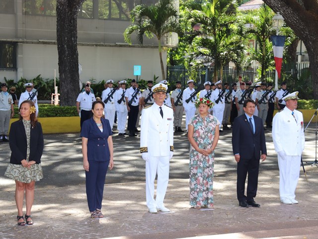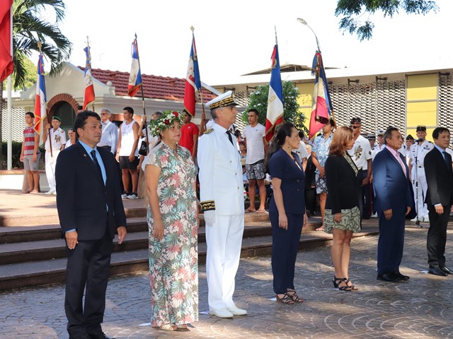 Cette cérémonie, empreinte d’une grande solennité et d’une émotion palpable était présidée par M. Dominique SORAIN, haut-commissaire de la République en Polynésie française et s’est tenue en présence de Mme Tea FROGIER, ministre de la modernisation de l’administration, représentant le Président de la Polynésie française, de Mme et M. les parlementaires et représentants Nicole SANQUER et Nuihau LAUREY, de M. Michel BUILLARD, Maire de Papeete et représentant à l’assemblée, du Contre-Amiral Laurent LEBRETON, commandant supérieur des forces armées en Polynésie française, de M. Kelly ASIN-MOUX, président du conseil économique, social, environnemental et culturel de la Polynésie française et de nombreux anciens combattants, soldats, militaires, citoyens, jeunes et moins jeunes, tous venus honorer le devoir de mémoire et d’hommage à celles et ceux qui se sont battus pour le monde libre.