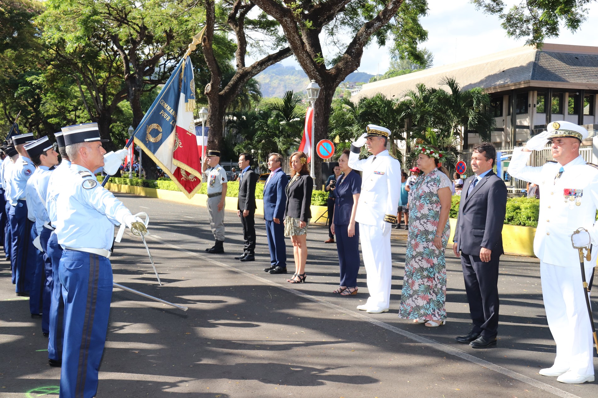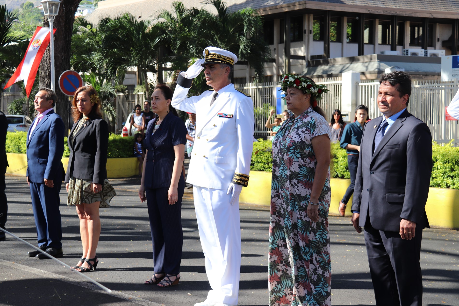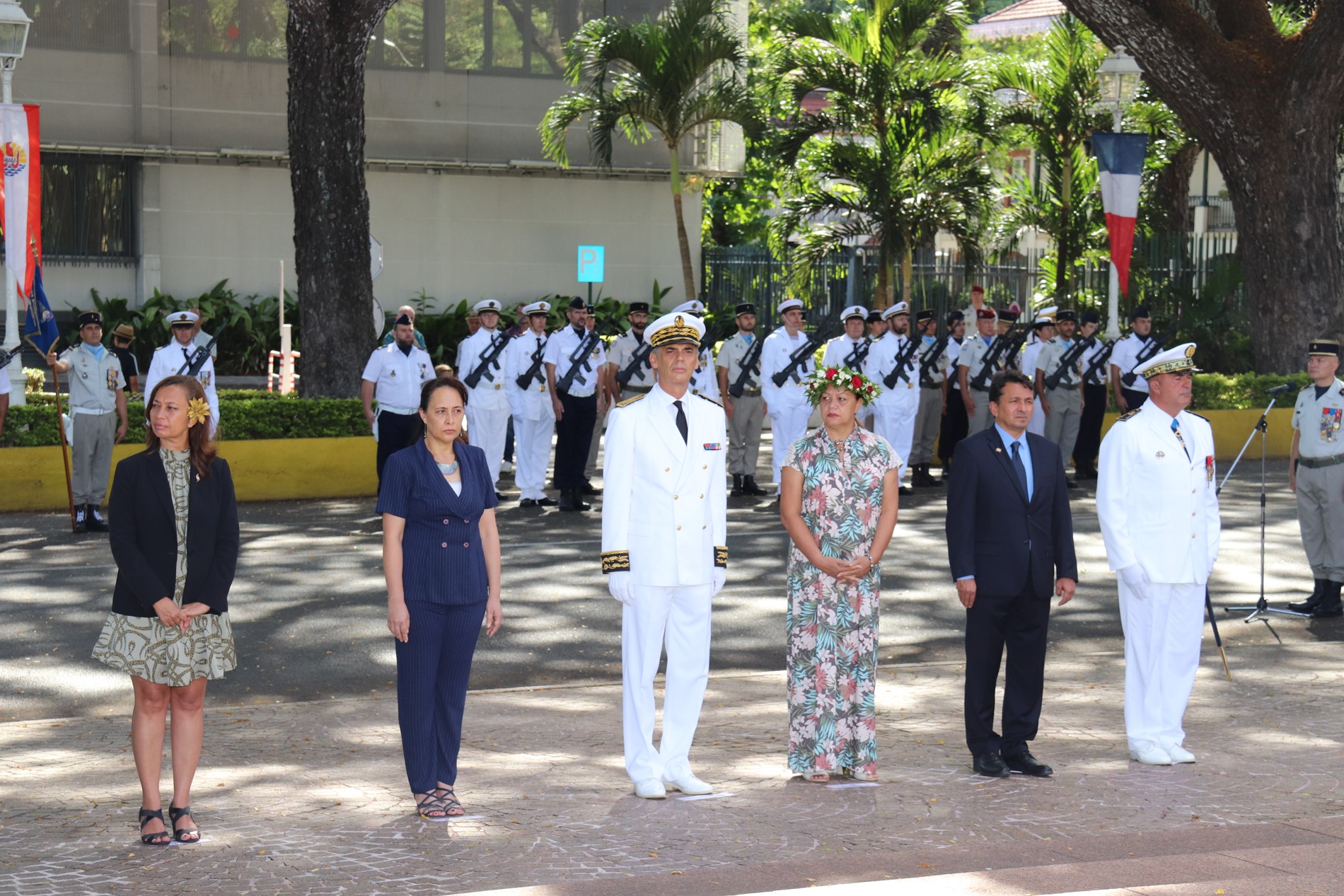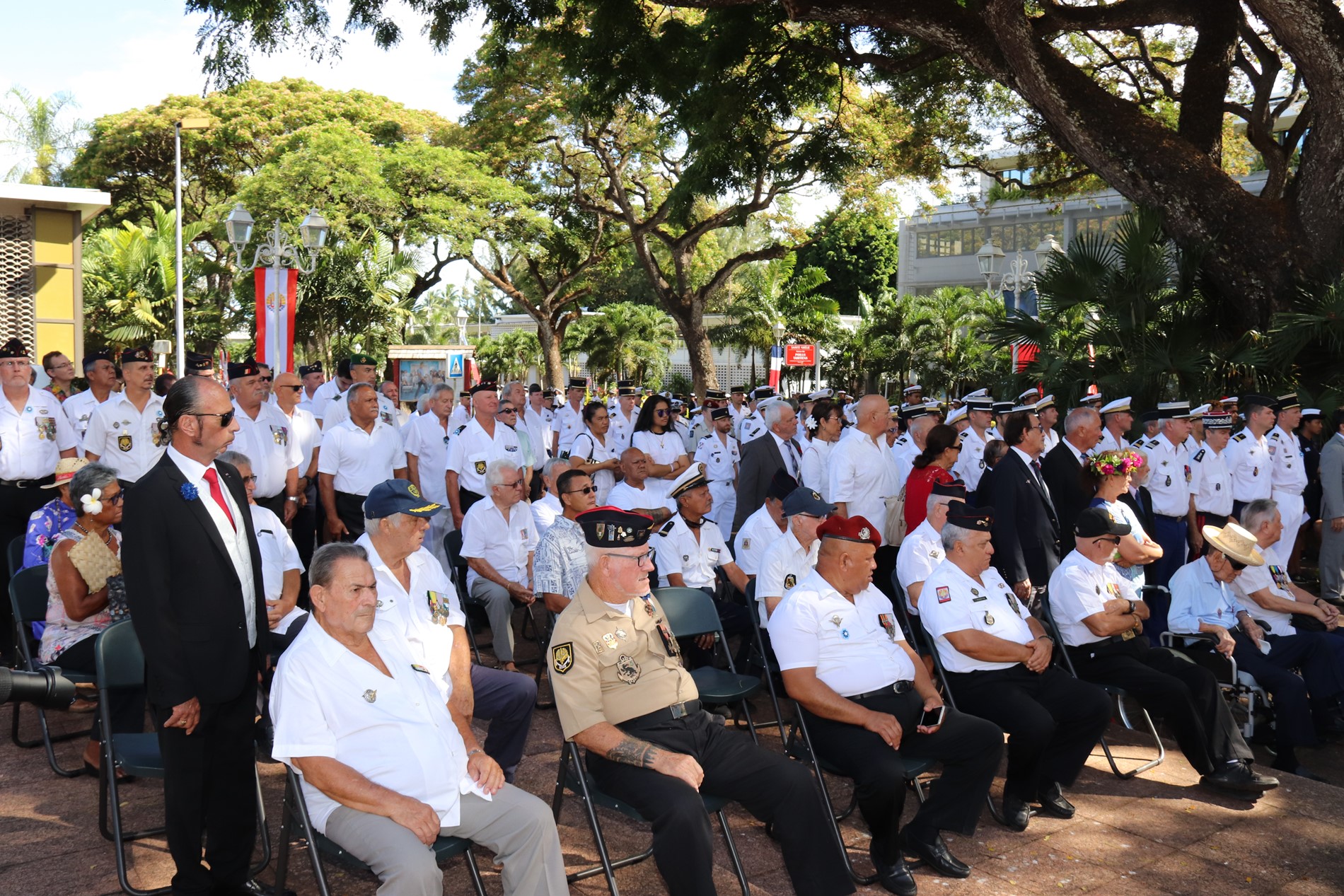 Cette cérémonie, empreinte d’une grande solennité et d’une émotion palpable était présidée par M. Dominique SORAIN, haut-commissaire de la République en Polynésie française et s’est tenue en présence de Mme Tea FROGIER, ministre de la modernisation de l’administration, représentant le Président de la Polynésie française, de Mme et M. les parlementaires et représentants Nicole SANQUER et Nuihau LAUREY, de M. Michel BUILLARD, Maire de Papeete et représentant à l’assemblée, du Contre-Amiral Laurent LEBRETON, commandant supérieur des forces armées en Polynésie française, de M. Kelly ASIN-MOUX, président du conseil économique, social, environnemental et culturel de la Polynésie française et de nombreux anciens combattants, soldats, militaires, citoyens, jeunes et moins jeunes, tous venus honorer le devoir de mémoire et d’hommage à celles et ceux qui se sont battus pour le monde libre.