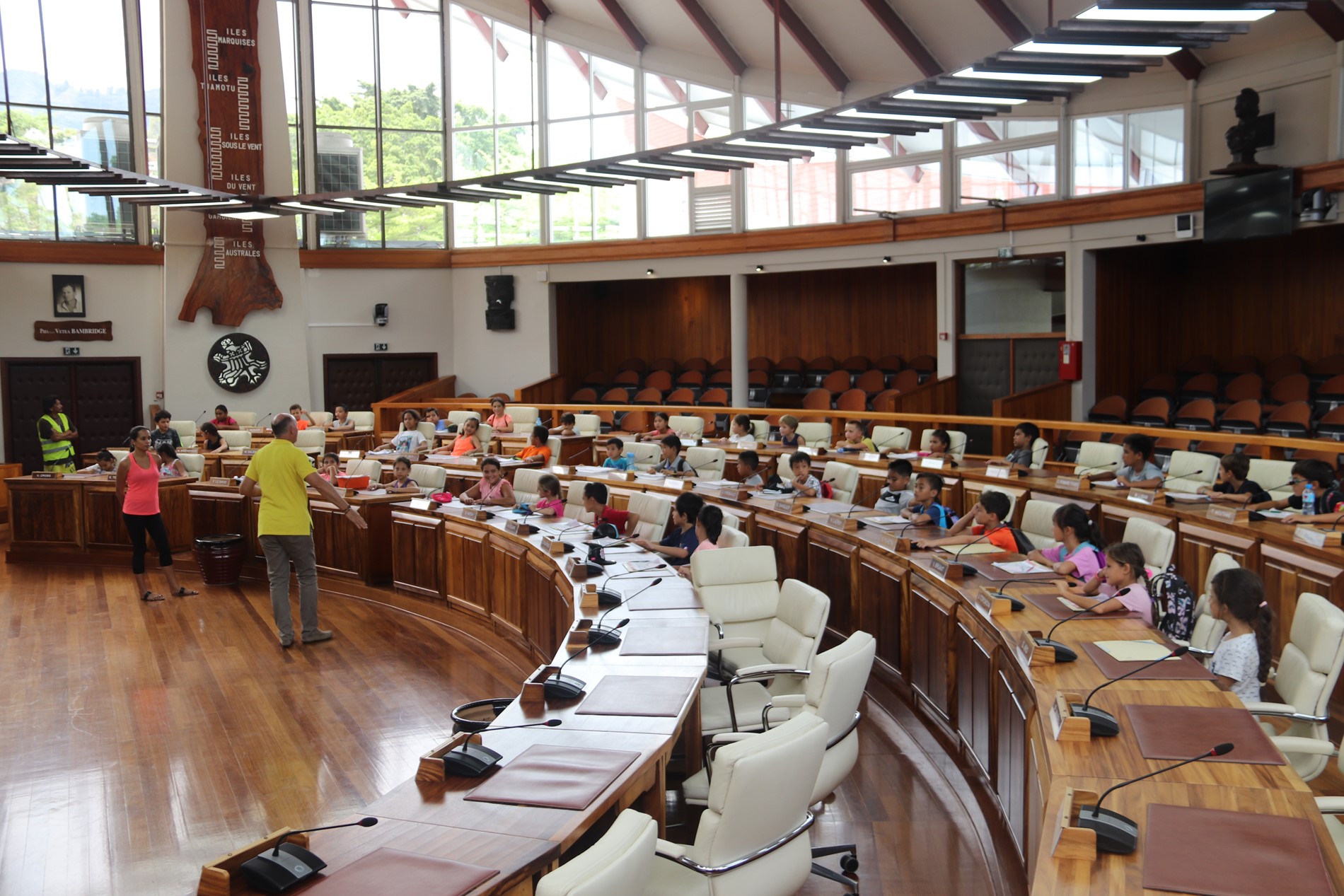 La visite a démarré par le hall René Leboucher et la présentation des panneaux listant les présidents de l’assemblée depuis 1946 et les 57 représentants, puis elle s’est poursuivie dans l’hémicycle Vetea Bambridge où les enfants, très curieux, ont pu interroger le guide de l’assemblée sur tous les aspects de la troisième institution du pays. Cette visite a permis aux élèves de mieux comprendre le rôle des 57 représentants, leur travail et leurs actions.