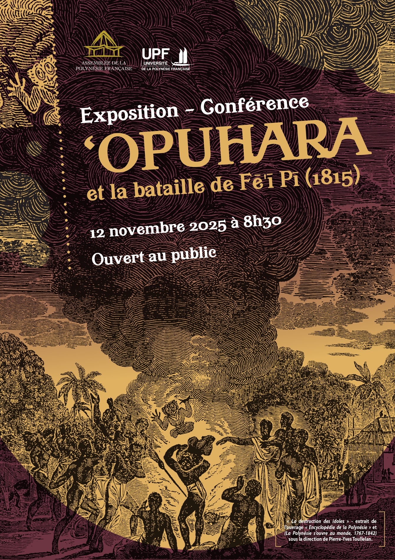 Sous l’impulsion de M. Antony GEROS, président de l’Assemblée de la Polynésie française, l’institution poursuit son cycle d’expositions consacrées à l’histoire du fenua, en inaugurant, le mercredi 12 novembre 2025, date commémorative de la bataille de Fē‘ī Pī (1815), l’exposition-conférence « ‘Opuhara et la bataille de Fē‘ī Pī ».