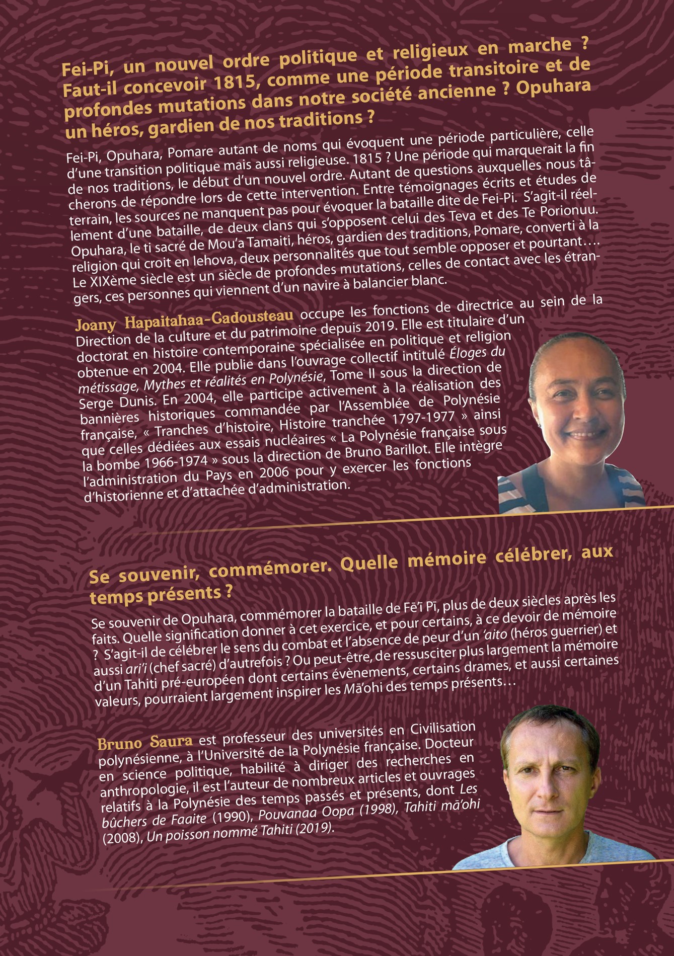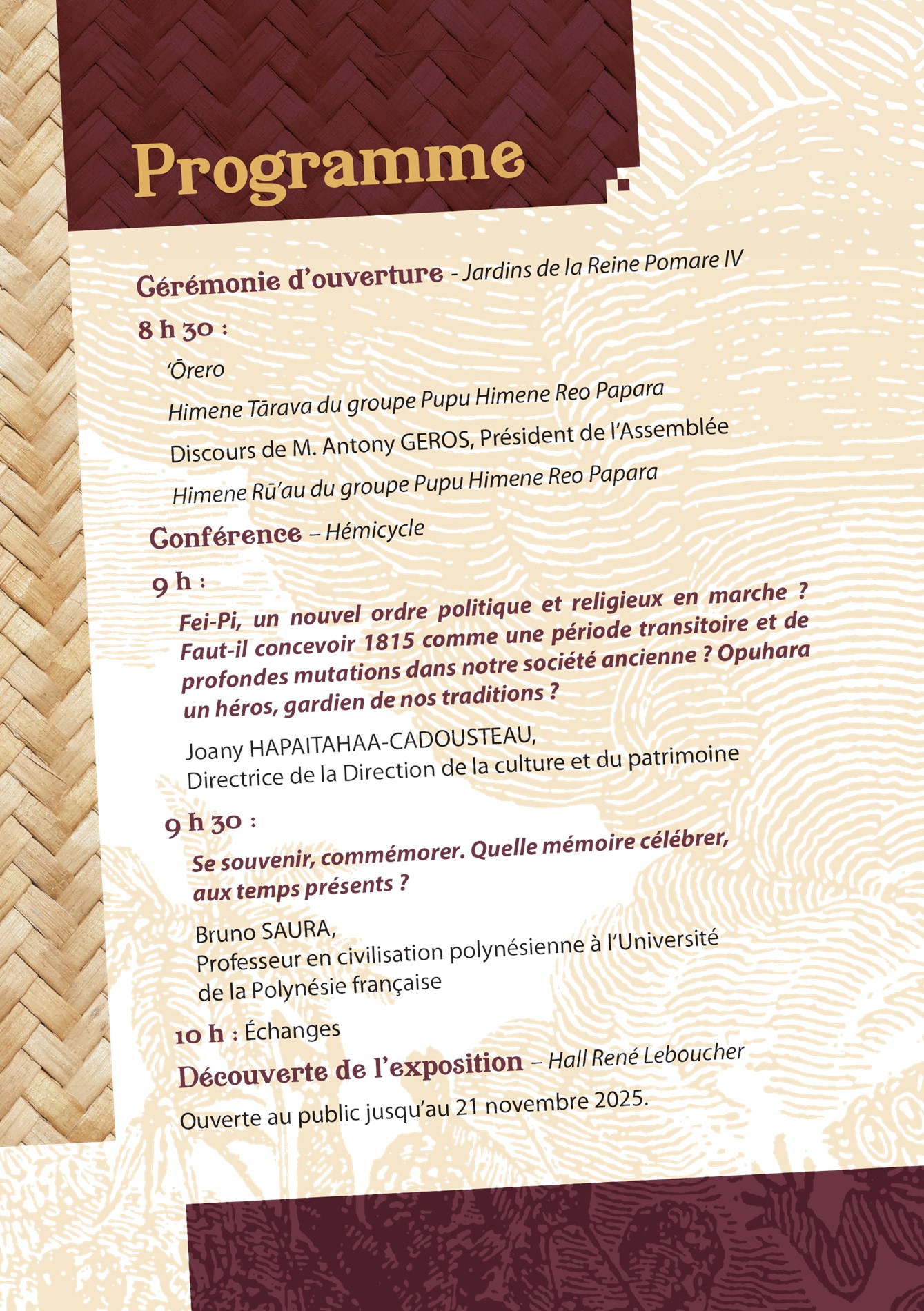 La cérémonie d’ouverture, se tiendra dans les jardins de la Reine Pomare IV à partir de 8h30. Puis la matinée se poursuivra dans l’hémicycle pour une conférence, avec deux interventions : Mme Joany HAPAITAHAA-CADOUSTEAU, sur le thème « Fei-Pi, un nouvel ordre politique et religieux en marche ? Faut-il concevoir 1815, comme une période transitoire et de profondes mutations dans notre société ancienne ? ‘Opuhara un héros, gardien de nos traditions ?» et M. Bruno SAURA, sur le thème « Se souvenir, commémorer. Quelle mémoire célébrer, aux temps présents ? », suivies d’un temps d’échange avec le public.