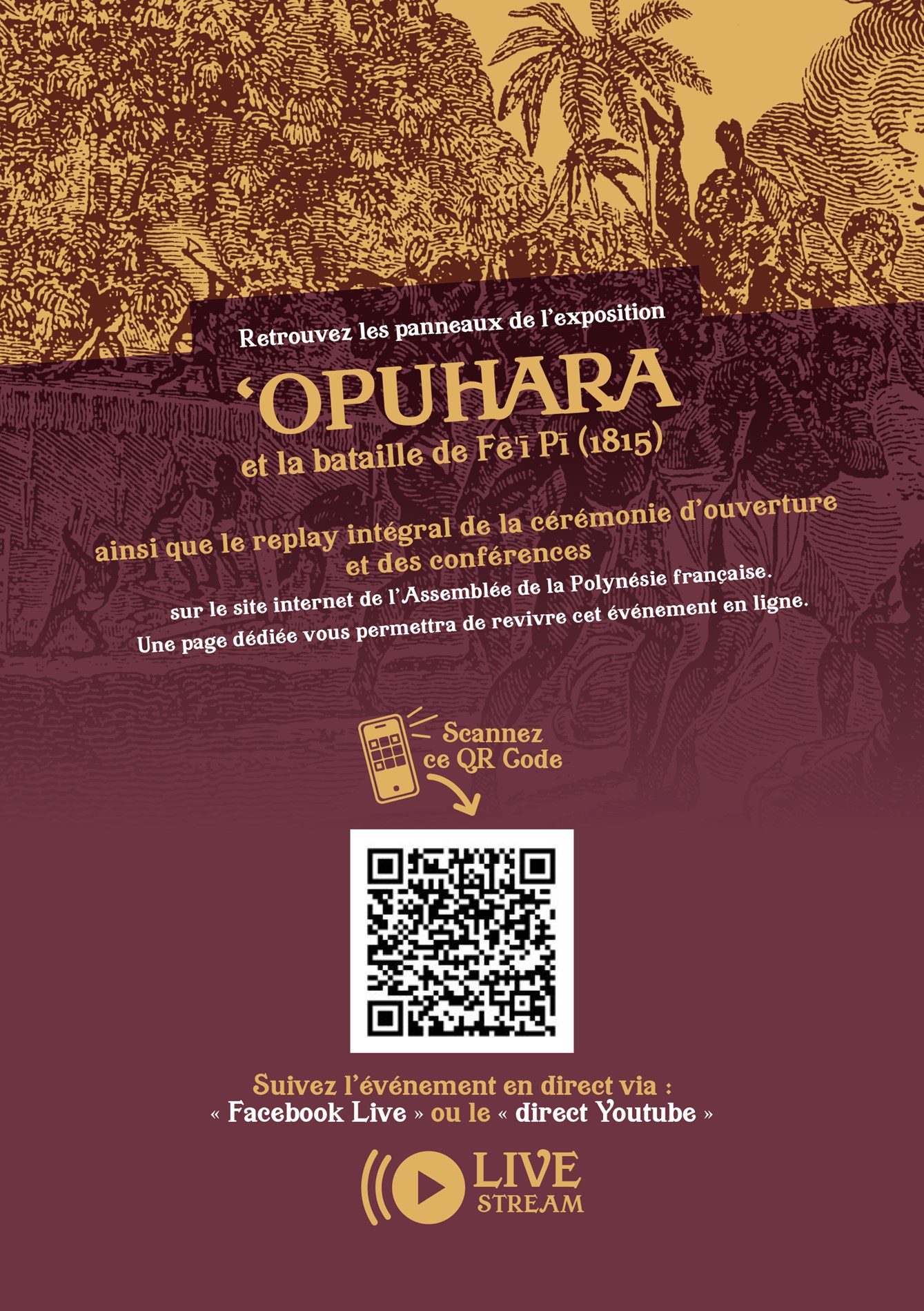 Conçue par M. Bruno SAURA, professeur en civilisation polynésienne à l’Université de la Polynésie française, qui a assuré la conception scientifique et la rédaction des textes, en collaboration avec Mme Joany HAPAITAHAA-CADOUSTEAU, directrice de la Direction de la culture et du patrimoine, cette exposition met en lumière un épisode déterminant de l’histoire de Tahiti : la bataille de Fē’ī Pī, survenue en novembre 1815, qui opposa le chef ‘Opuhara, figure emblématique des Teva de Papara, au roi Pōmare II. Véritable tournant politique et spirituel, cet affrontement marque la fin d’un ordre ancien et l’avènement d’un nouveau pouvoir unifié sous le signe du christianisme.