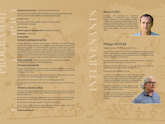 L’événement s’ouvrira dès 8h30 dans les jardins de la Reine Pomare IV par une cérémonie d’ouverture culturelle, suivie d’une visite inaugurale de l’exposition, puis à 9h30, d’une conférence publique animée par deux intervenants :