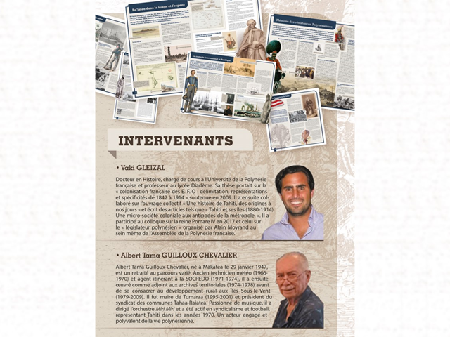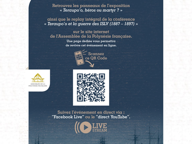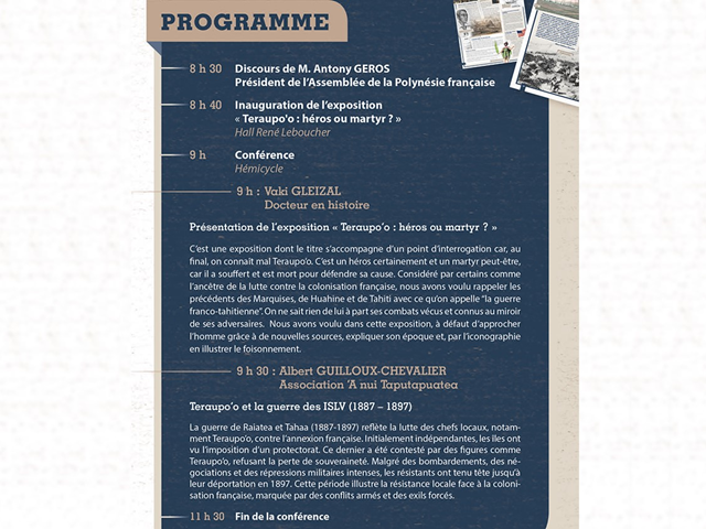 À 9 h, une conférence publique se tiendra dans l’hémicycle de l’institution. Elle sera animée par M. Vaki Gleizal, docteur en histoire, qui présentera le contexte historique et les enjeux majeurs abordés dans l’exposition. Puis M. Albert Guilloux-Chevalier, membre de l’association « A Nui Taputapuātea », interviendra sur le thème « Teraupo’o et la guerre des Îles Sous-le-Vent (1887–1897) ».