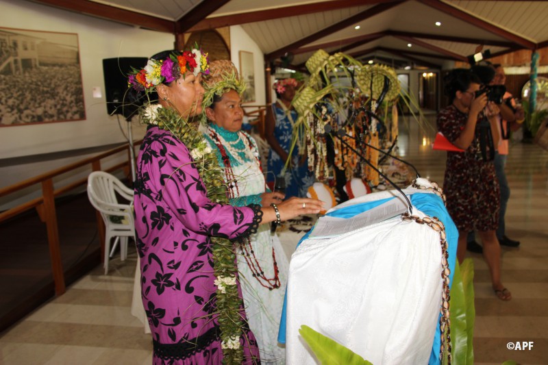 En présence des représentants du gouvernement, des représentants à l’assemblée, du Haut-commissaire accompagné de son secrétaire général, des membres du comité organisateur Tahiti te rima rau, la deuxième vice-présidente de l’assemblée, remplaçant M. Marcel TUIHANI en déplacement en métropole, a accueilli les exposants issus de l’archipel des Tuamotu-Gambier.
