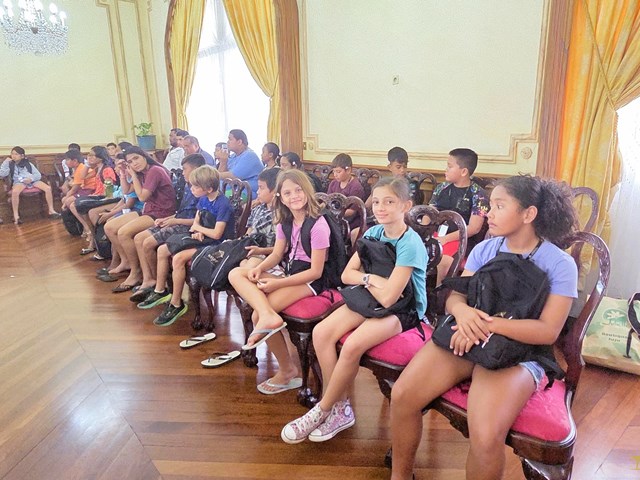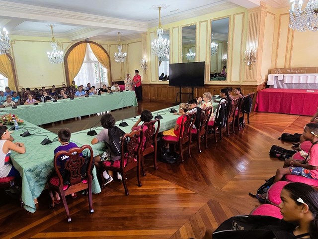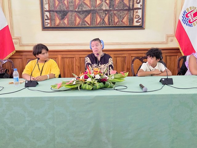 Les 57 représentants juniors se sont ensuite rendus à la Présidence de la Polynésie française, où ils ont été accueillis dans le salon d’honneur par Mme Nathalie SALMON-HUDRY, déléguée interministérielle au Handicap et à l’Inclusion, représentant le président du Pays. Ce cadre propice aux échanges a permis aux jeunes élus de découvrir les lieux, notamment la salle du Conseil des ministres.