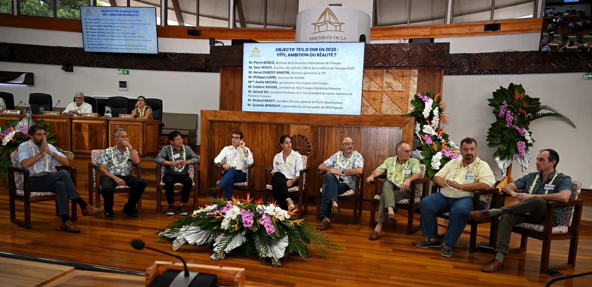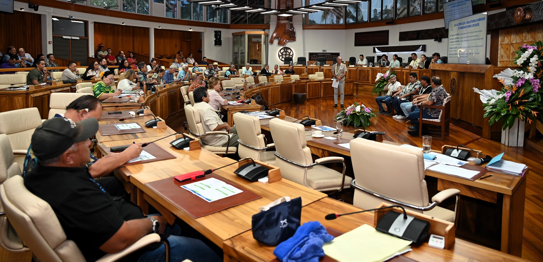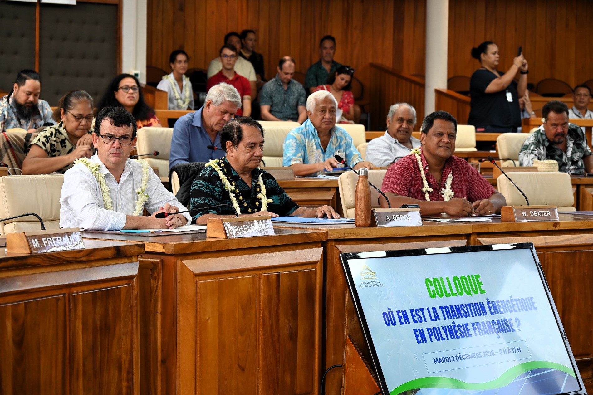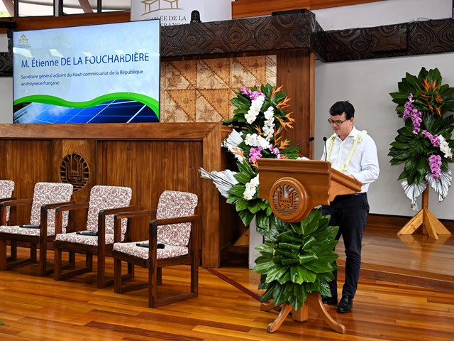 Dans son allocution d’ouverture, M. Antony GEROS, président de l’Assemblée, a rappelé que la transition énergétique constitue un enjeu majeur pour la souveraineté économique et environnementale du Pays, soulignant que la forte dépendance aux hydrocarbures représente une dépense annuelle importante qui pèse sur la balance commerciale. M. Warren DEXTER, ministre de l’Économie, du Budget et des Finances en charge des énergies, ainsi que M. Étienne DE LA FOUCHARDIÈRE, représentant le Haut-commissaire, ont également insisté sur l’importance stratégique de cette transition pour l’autonomie, la sécurité et le développement durable de la Polynésie française.