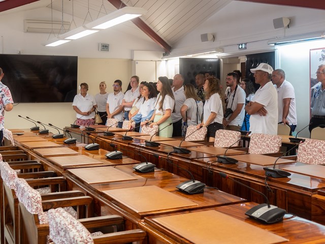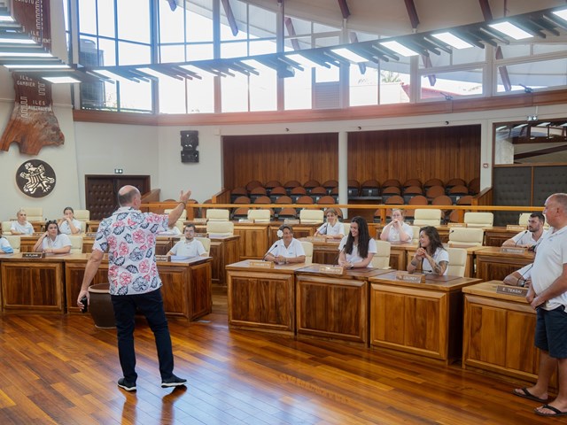 La visite a débuté dans le hall René LEBOUCHER avec les différents panneaux d’information présents puis le groupe s’est rendu dans la salle Sonia AGNIERAY-THUNOT. La visite s’est poursuivie dans l’hémicycle de l’assemblée et s’est terminée dans les jardins de la Reine Pomare IV.