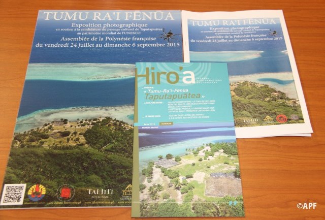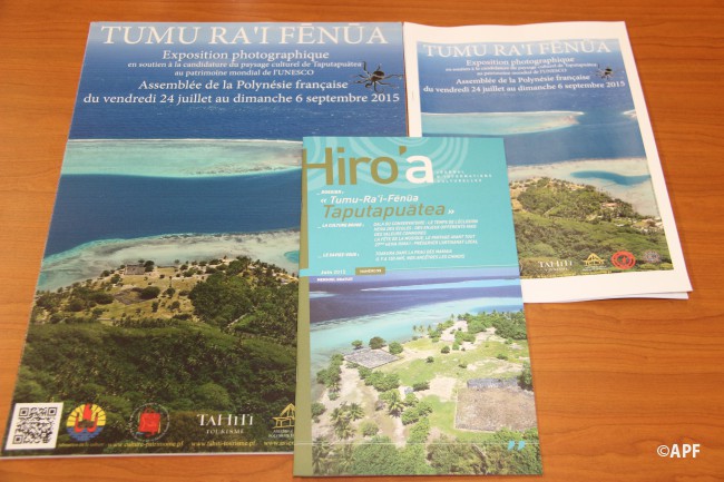Cette exposition photographique, en soutien à la candidature du paysage culturel de Taputapuatea au patrimoine mondial de l'Unesco a été élaborée par le Service de la Culture et du Patrimoine de la Polynésie française, en partenariat avec le GIE Tahiti Tourisme. Elle a déjà était présenté à la population de Raiatea en avril dernier, et sera hébergée par l’Assemblée de la Polynésie française du 24 juillet au 6 septembre 2015. Elle comprend 90 kakémonos, qui retracent les trois années dernières années au cours desquelles plusieurs missions de terrain ont été effectuées par les agents du Service de la Culture et du Patrimoine en vue de faire aboutir la candidature au label « Patrimoine Mondial de l’Unesco » du « Paysage culturel Taputapuatea ».