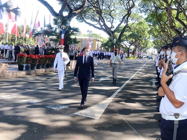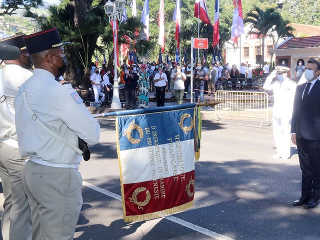 À son arrivée sur place, le Président de la République a d’abord effectué une revue des troupes présentes aux abords de l’avenue Pouvanaa a Oopa. Après le message républicain lu par des collégiens de Tipaerui en langue française et en tahitien, c’est la chorale du conservatoire artistique de Polynésie française qui a eu l’honneur d’entonner la Marseillaise en présences des 2000 invités présents pour l’occasion.