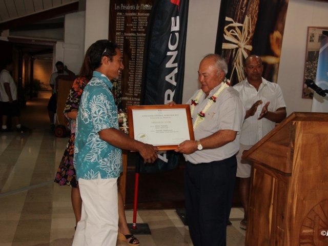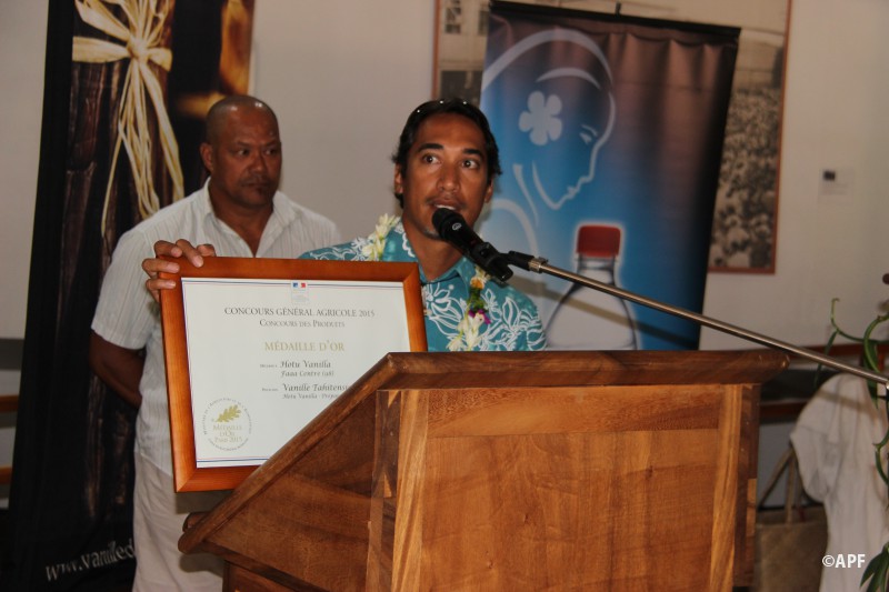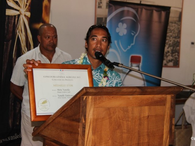 Enfin, M. Frédéric RIVETA, ministre de l’agriculture, après avoir salué le travail des producteurs de vanille et précisé qu’un plan de relance de la vanille a été mis en place, a remis le diplôme de la Médaille d’or au concours général agricole 2015 à la Société Hotu VANILLA, représenté par le fils de M. Guy TAUATITI.