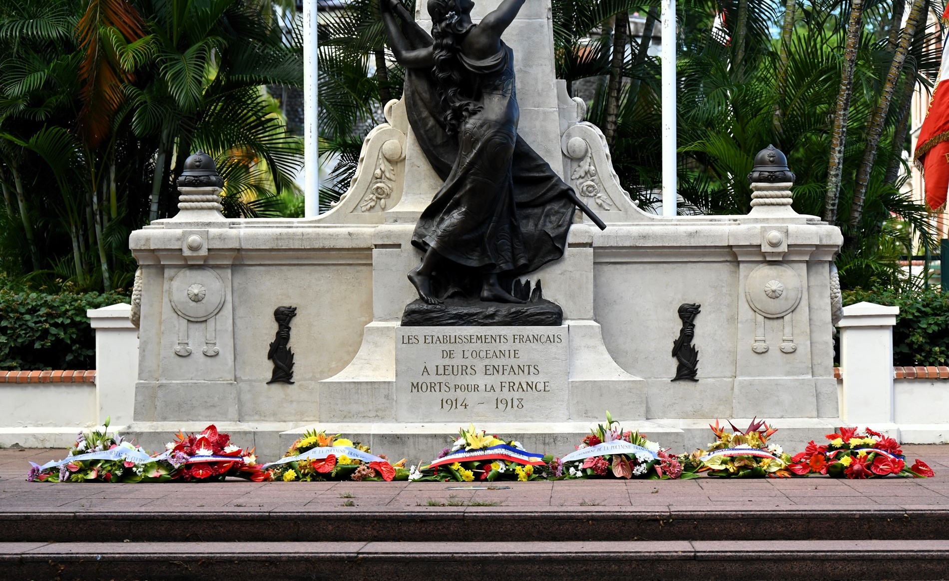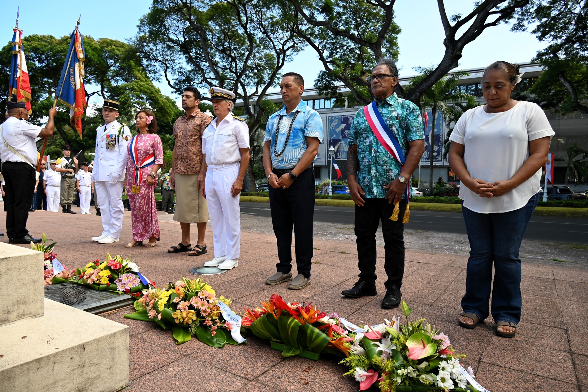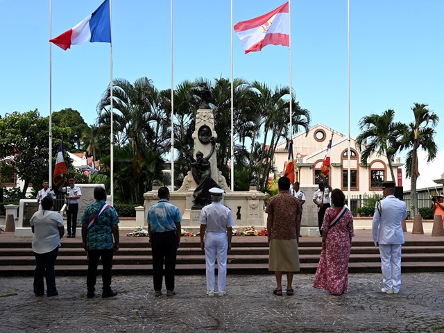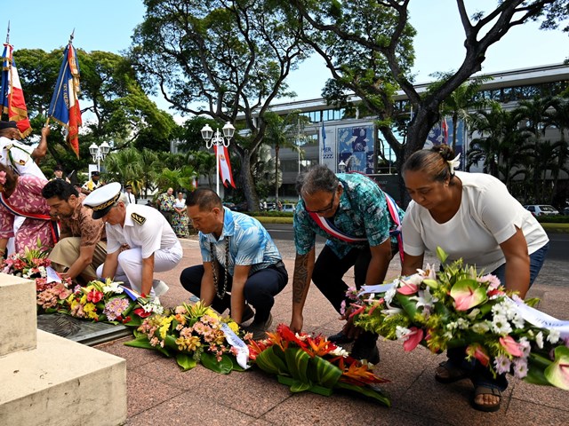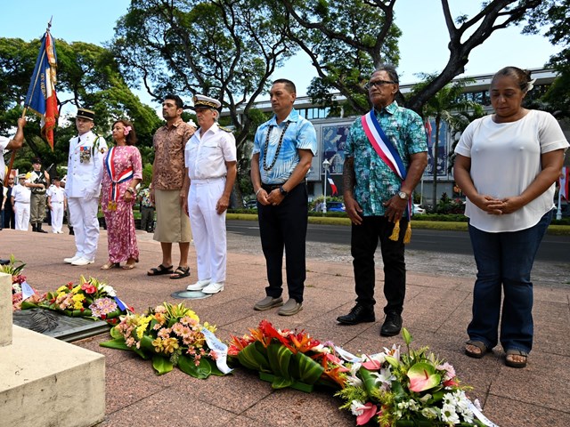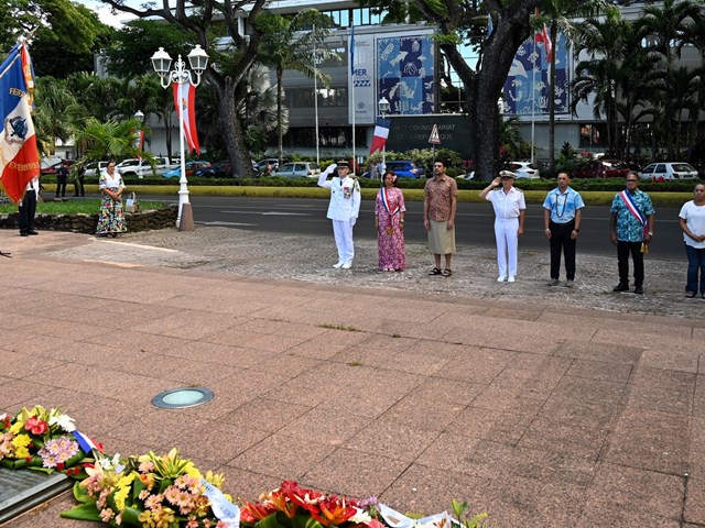 Après la lecture du message de la ministre déléguée auprès de la ministre des Armées et des Anciens combattants par le représentant de l’État, un dépôt de gerbes a été effectué au pied du monument aux Morts de Papeete, sur l’avenue Pouvana’a a Oopa.