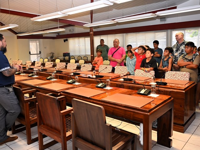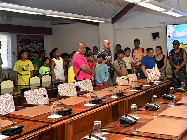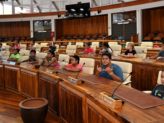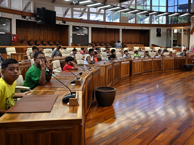 La visite s’est poursuivie dans l’hémicycle Vetea BAMBRIDGE, lieu où siègent les 57 représentants dans le cadre de leurs missions législatives. Les élèves y ont été invités à prendre place, découvrant ainsi le cœur de la vie démocratique polynésienne.