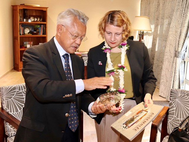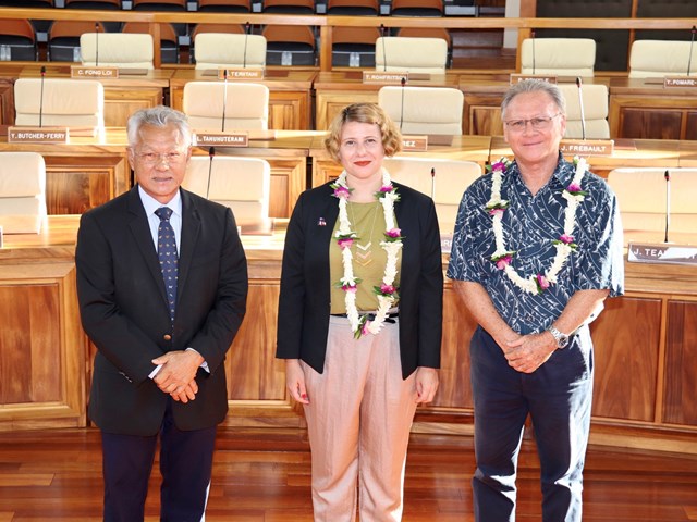Le président de l'assemblée, M. Gaston TONG SANG, a reçu le mardi 8 juin, en entretien protocolaire, Mme Claire SCOTT, Consule générale d'Australie pour la Polynésie française en fonction depuis le mois de mai dernier. Elle était accompagnée lors de cette rencontre de M. Marc SIU qui a assuré pendant 19 années, et jusqu'à l'installation récente du consulat général australien au fenua, les fonctions de Consul honoraire d'Australie.