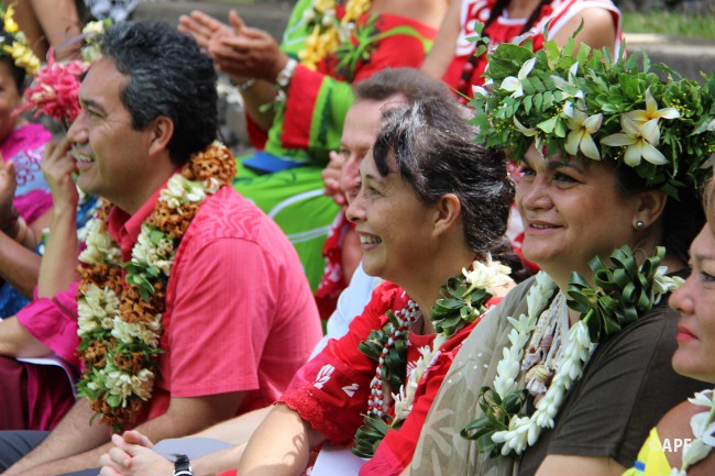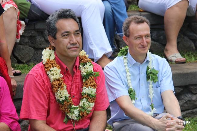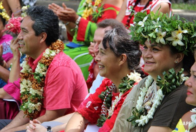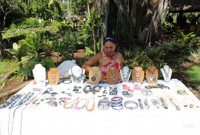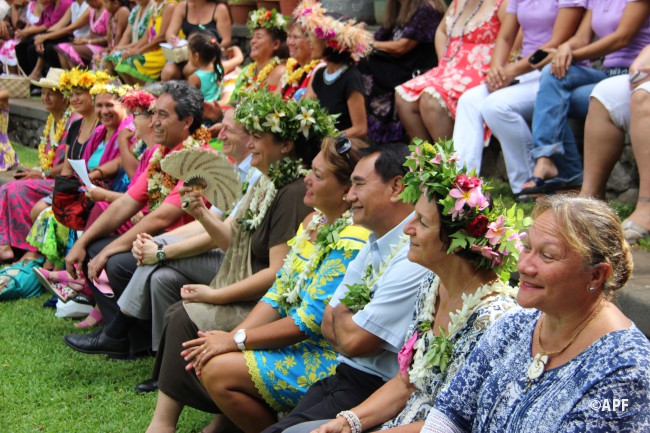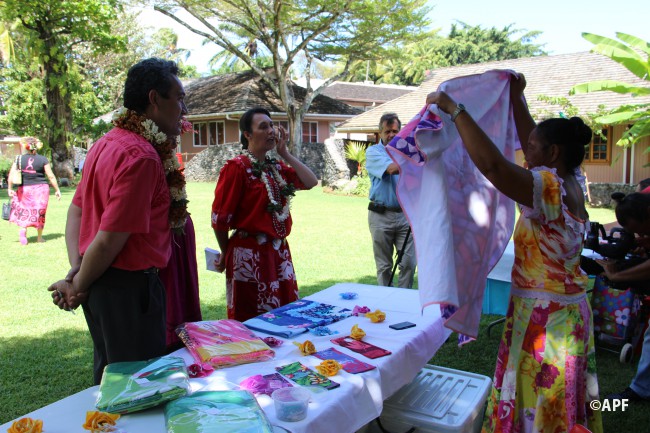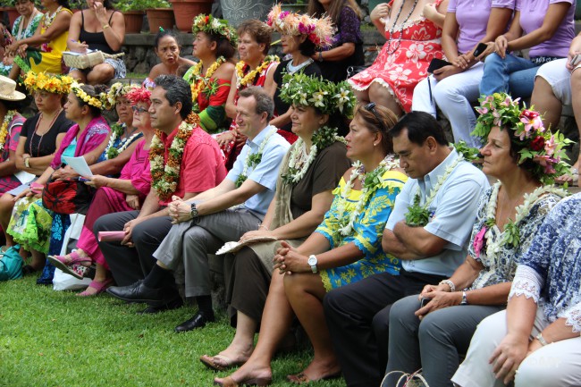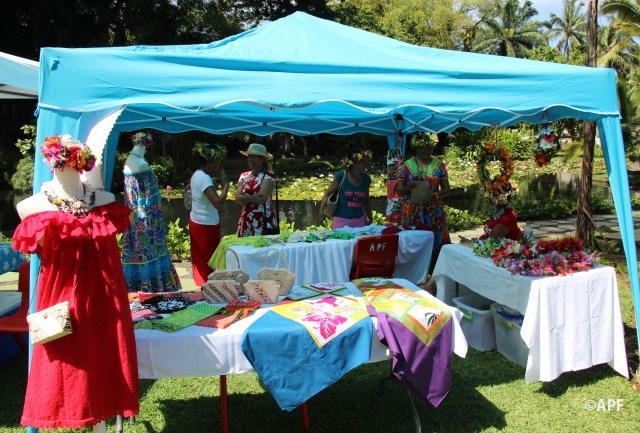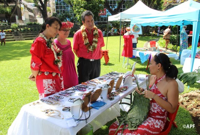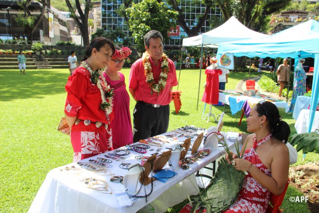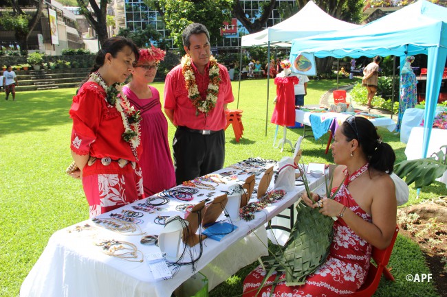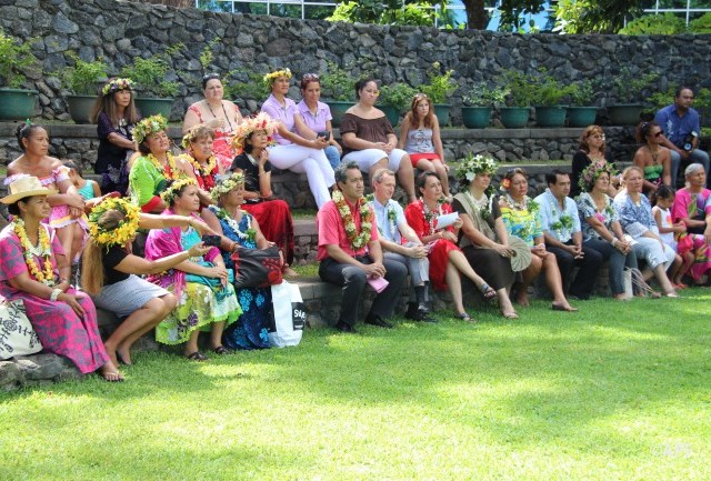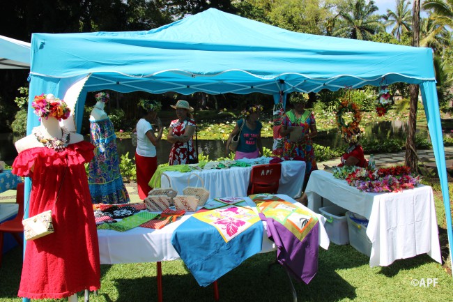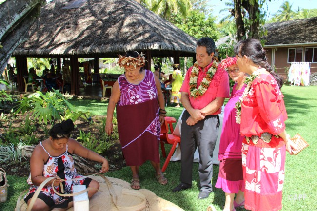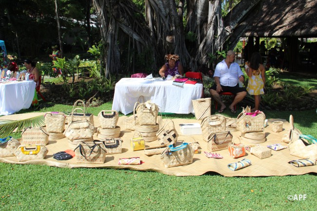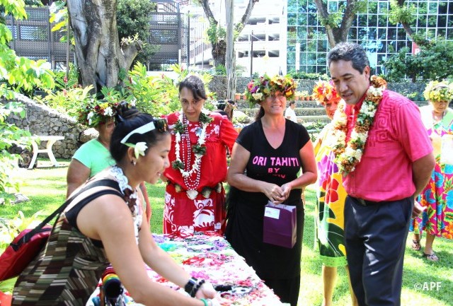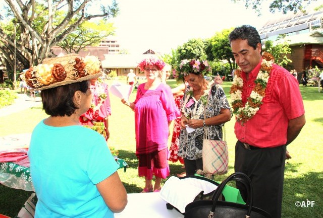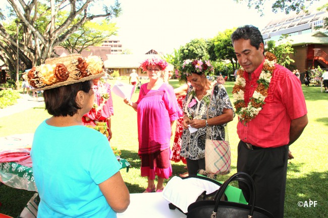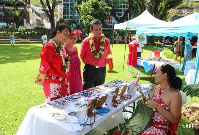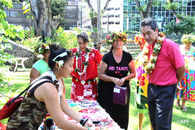 En présence du secrétaire général du haut-commissariat de la République, de nombreux représentants à l’assemblée et du public, le président de l’assemblée a prononcé un mot d’accueil pour ces artisanes fleuries et colorées qui présentent bijoux, vêtements, confitures ainsi que peintures, confection de tapas, ou découpes de tifaifai.