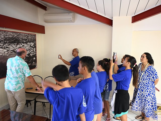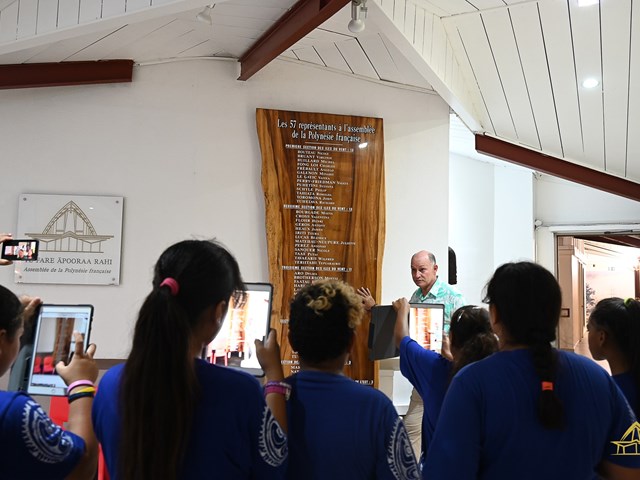 La visite guidée a débuté par la présentation du hall René LEBOUCHER et des différents panneaux d’informations qui s’y trouvent. Le groupe a ensuite pu entrer dans l’une des salles des commissions avant d’admirer la salle Vetea BAMBRIDGE, où leur ont été présentés les différents symboles qui ornent les murs de l'hémicycle ainsi que le fonctionnement d’une séance plénière. Le parcours s’est terminé par les verdoyants jardins de la Reine Pomare IV où les enfants ont été particulièrement fascinés par le bassin de la Reine et son histoire.