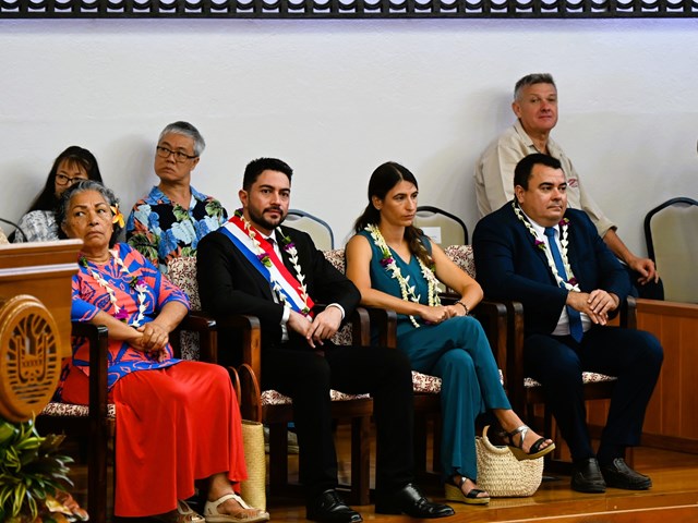 À cette occasion, plusieurs personnalités étaient présentes dans l’hémicycle, notamment le haut-commissaire, le Président de la Polynésie française et les membres de son gouvernement, les parlementaires nationaux, le président du conseil économique, social, environnemental et culturel, le procureur général, le secrétaire général du gouvernement, les chefs de service de l’assemblée, le président de la chambre de commerce, les représentants du monde patronal et des syndicats de salariés et les membres de l’Académie tahitienne.