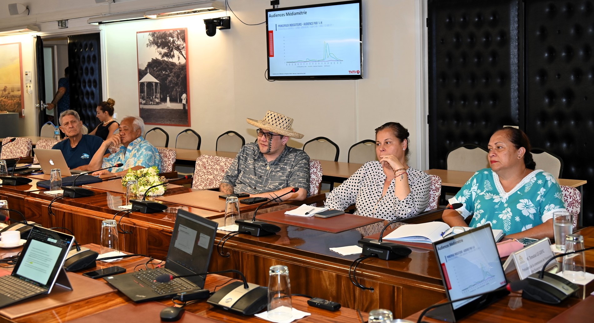 Les intervenants ont rappelé que TNTV demeure la première chaîne du fenua, avec 40,9 % de part d’audience selon Médiamétrie en 2023 et environ 80 000 téléspectateurs quotidiens. Les journaux télévisés constituent les principaux temps forts de la journée, et la chaîne se distingue par la place importante qu’elle accorde aux programmes locaux, qui représentent 46 % de sa grille.