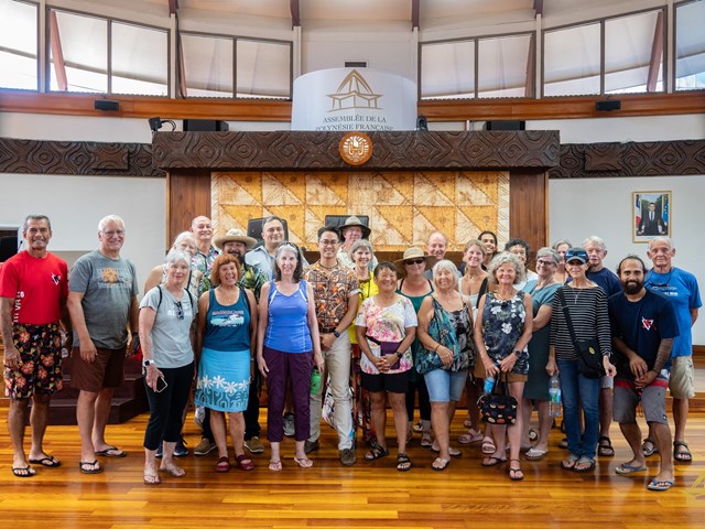 Ces rameurs, âgés entre 60 et 70 ans, ont débuté le parcours de la visite dans le hall René LEBOUCHER avec ses panneaux d’informations. Ils se sont ensuite dirigés vers la salle Sonia AGNIERAY-THUNOT, où ils ont pu découvrir l’histoire de l’institution. Puis, ils ont pu visiter la salle de l’hémicycle et en apprendre davantage sur le rôle des élus ainsi que les différents symboles culturels présents dans la salle. Le parcours de la visite s’est terminé dans les jardins de la Reine Pomare IV.