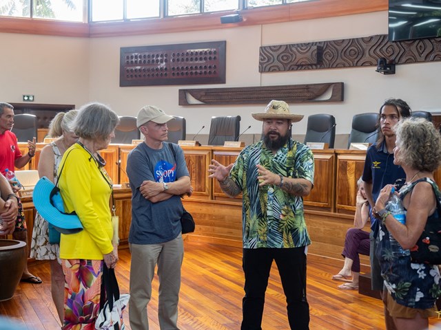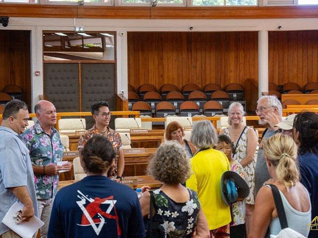 Lundi 26 juin 2023, un groupe de 21 rameurs américains a été accueilli au sein de l’assemblée de la Polynésie française afin de participer à une visite guidée des lieux. Ces sportifs, venus de l’île de Big Island à Hawaii pour pratiquer le va’a à Tahiti, ont profité de l’occasion pour visiter le centre-ville de Papeete ainsi ses instances politiques. Le groupe était accompagné de MM. Cliff LOUSSAN et Tevaipaea HOIORE, tous deux représentants à l’assemblée, et d'un membre de la direction de Tahiti Va’a, M. Milton LAUGHLIN.