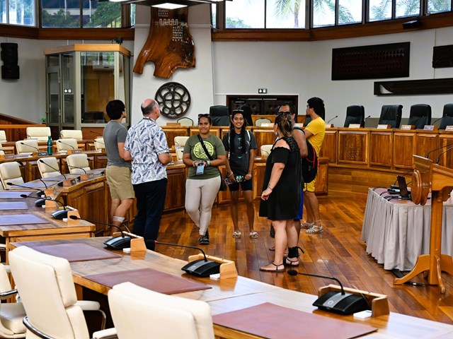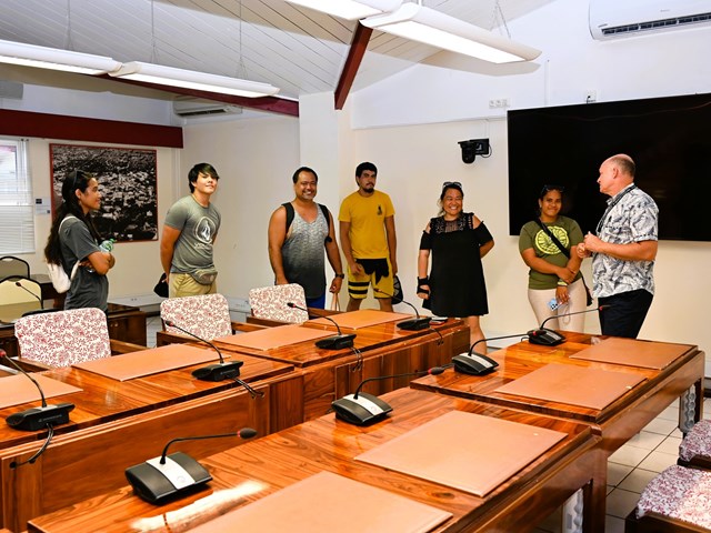 La découverte s’est poursuivie dans l’hémicycle Vetea BAMBRIDGE, cœur des débats parlementaires. Assis dans les fauteuils des représentants, ils ont observé les décors symbolisant les cinq archipels de la Polynésie française, reflet de l’unité et de la diversité culturelle du pays.