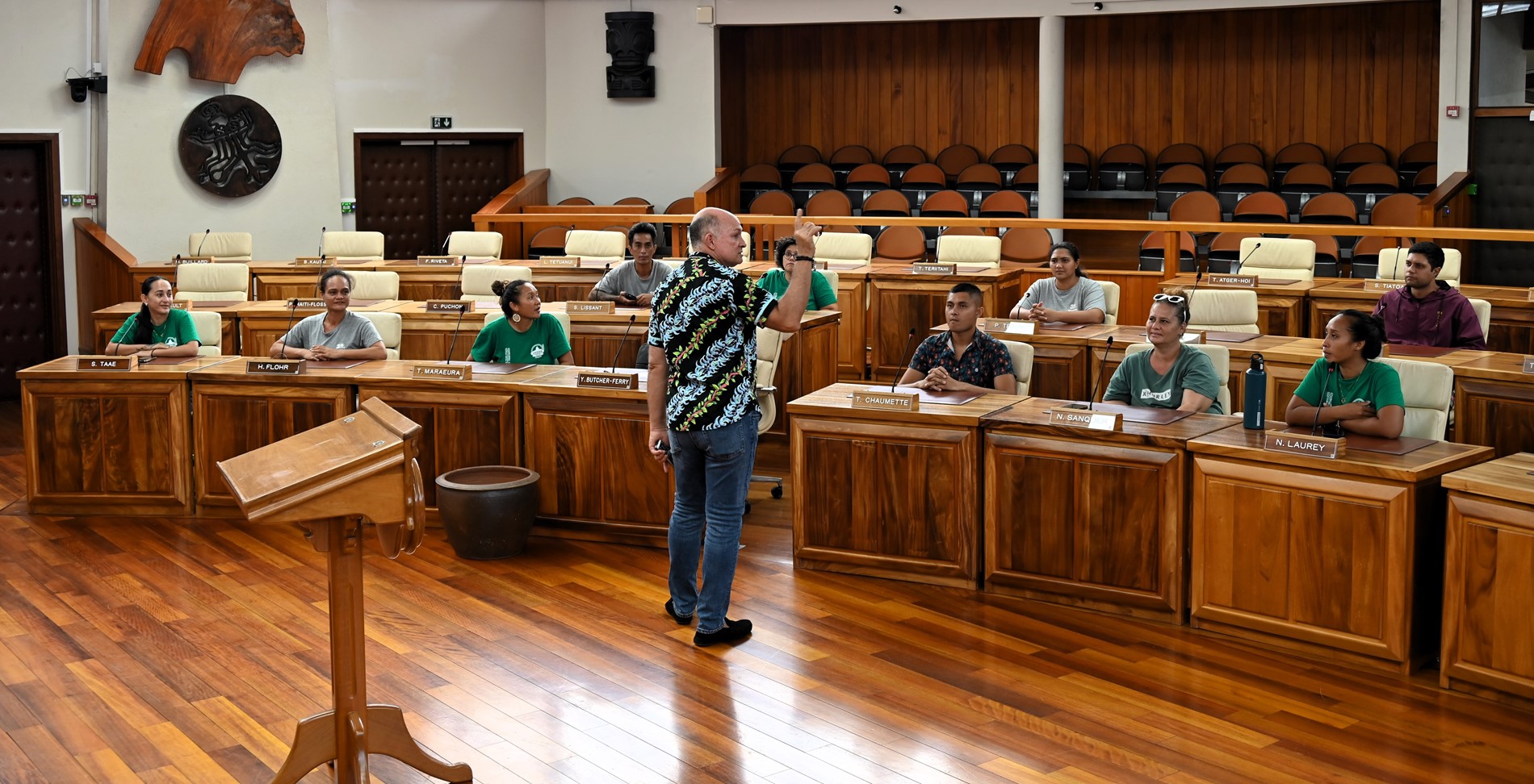La découverte s’est poursuivie dans l’hémicycle Vetea BAMBRIDGE, cœur des débats parlementaires. Assis dans les fauteuils des représentants, ils ont observé les décors symbolisant les cinq archipels de la Polynésie française, reflet de l’unité et de la diversité culturelle du pays.