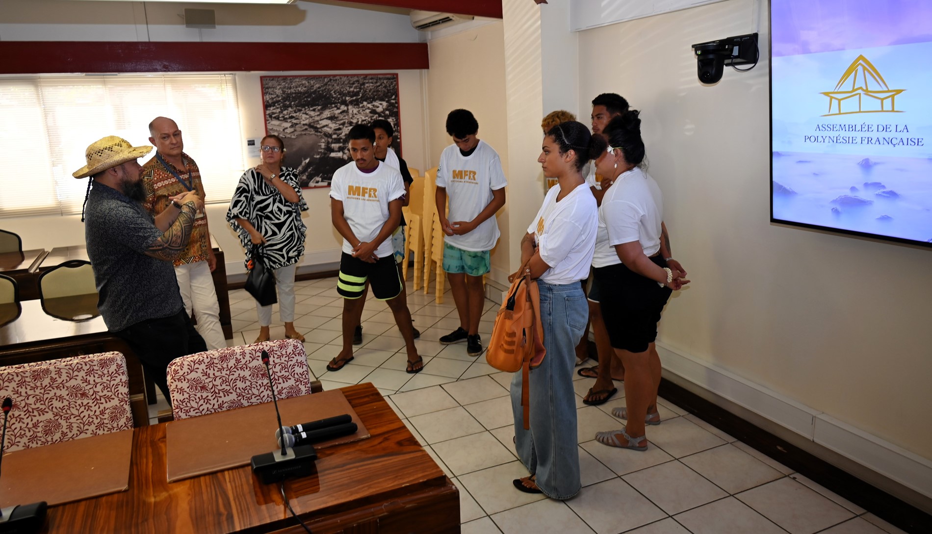 Le groupe a ensuite été accueilli dans la salle des commissions Sonia AGNIERAY-THUNOT, où un temps d’échanges a pu avoir lieu avec M. Tevaipaea HOIORE, vice-président de la commission de l'éducation, de la jeunesse et des sports.