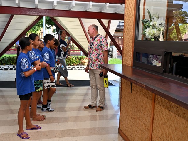 La découverte s’est poursuivie dans l’hémicycle Vetea BAMBRIDGE, où les élèves ont observé les œuvres symbolisant les cinq archipels de la Polynésie française.