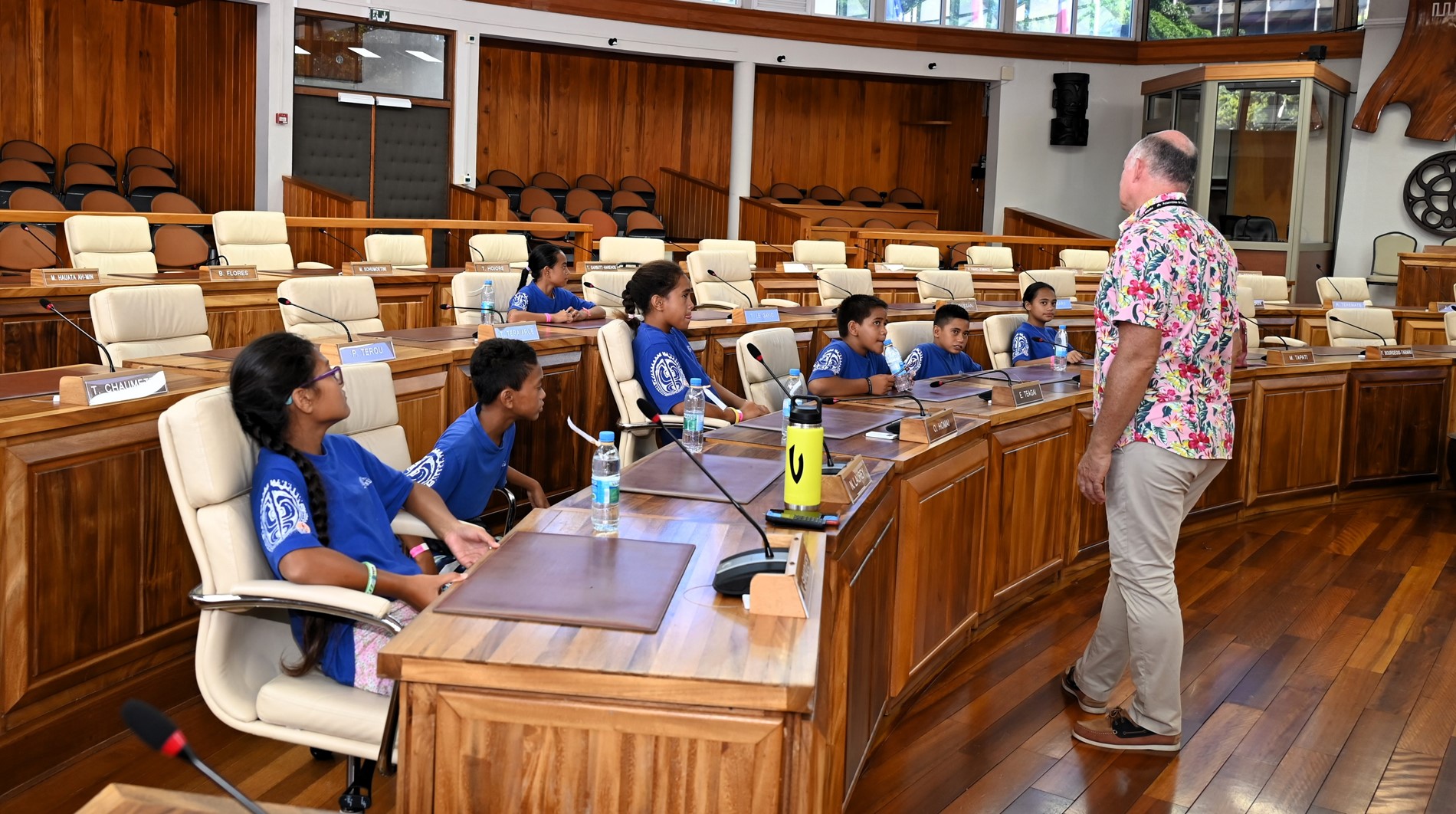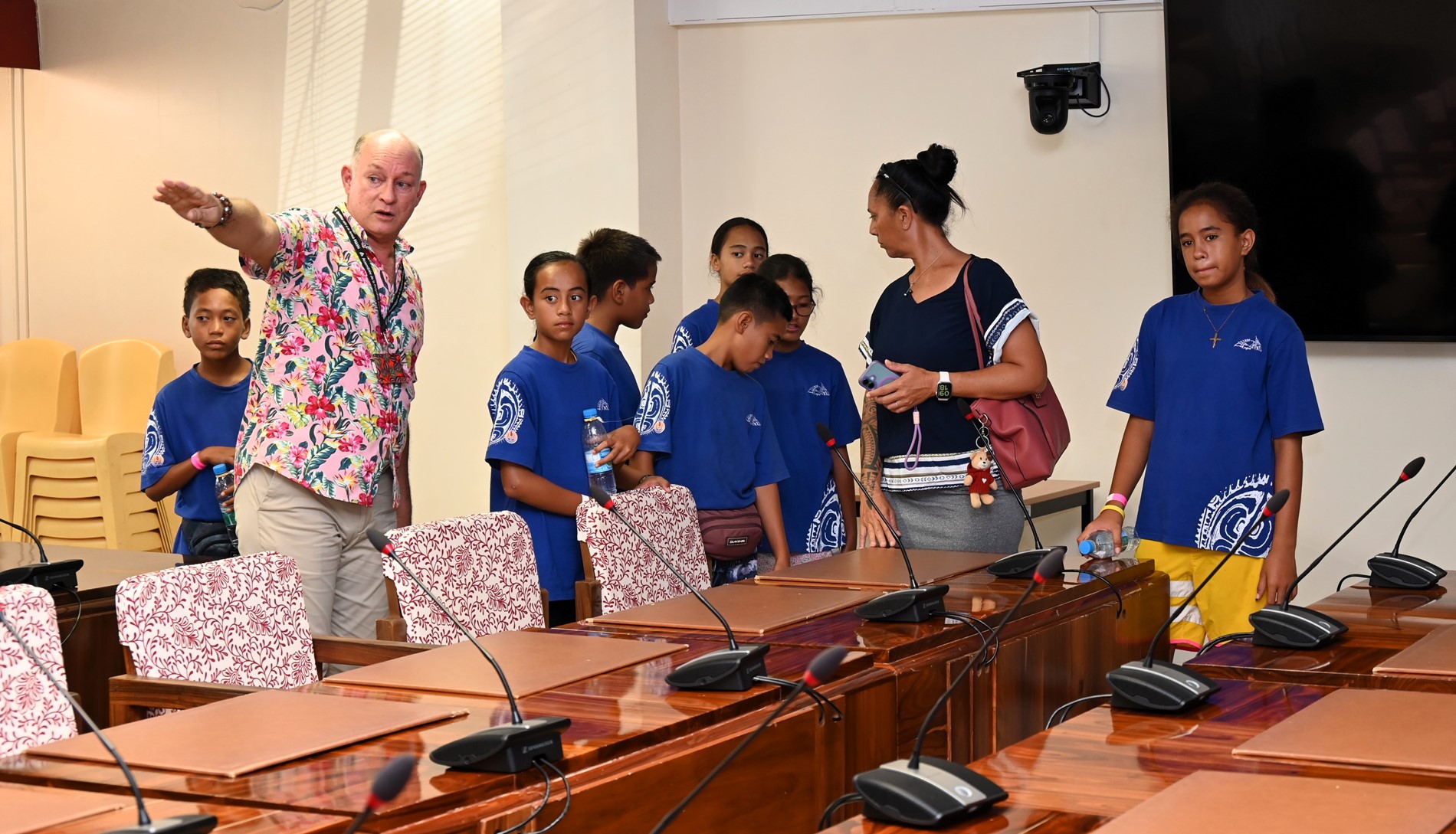 Ce lundi 16 mars 2026, sept élèves de 6e scolarisés dans une classe implantée au sein de l’école primaire de Manihi, accompagnés de leurs enseignants, ont été accueillis à l’Assemblée de la Polynésie française dans le cadre d’une immersion pédagogique.
