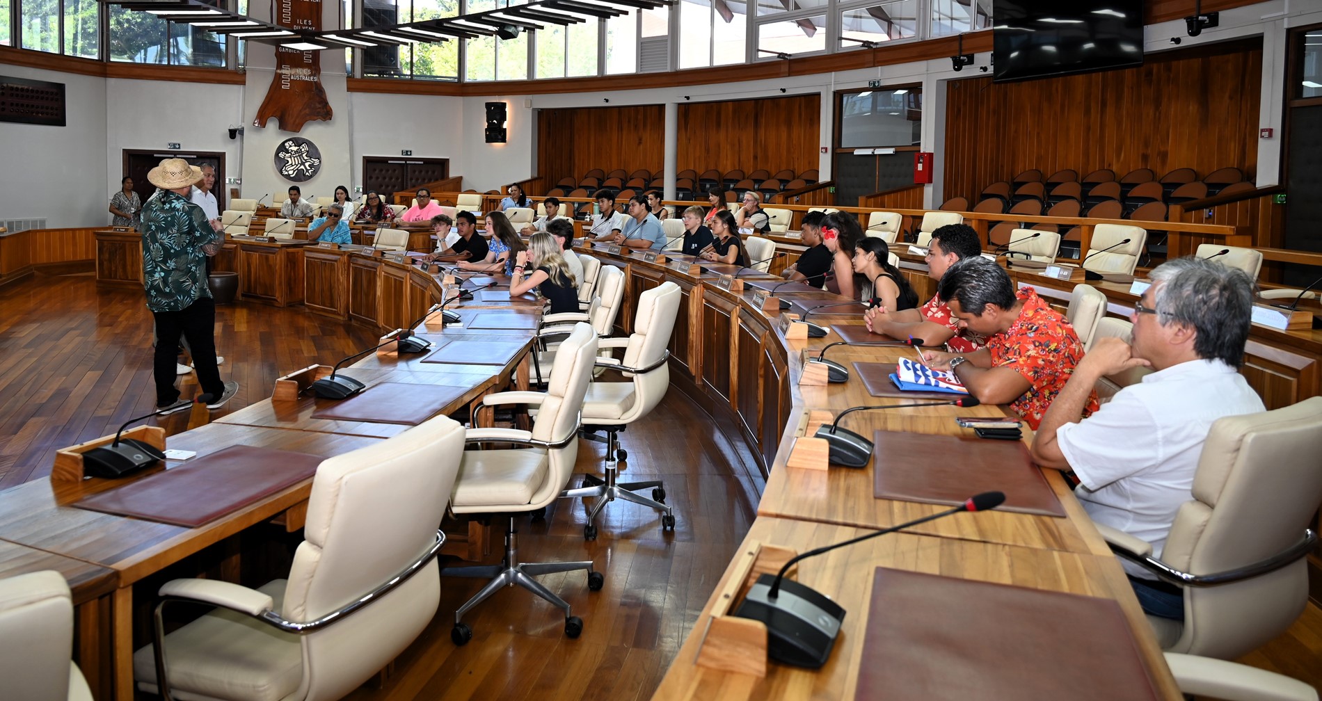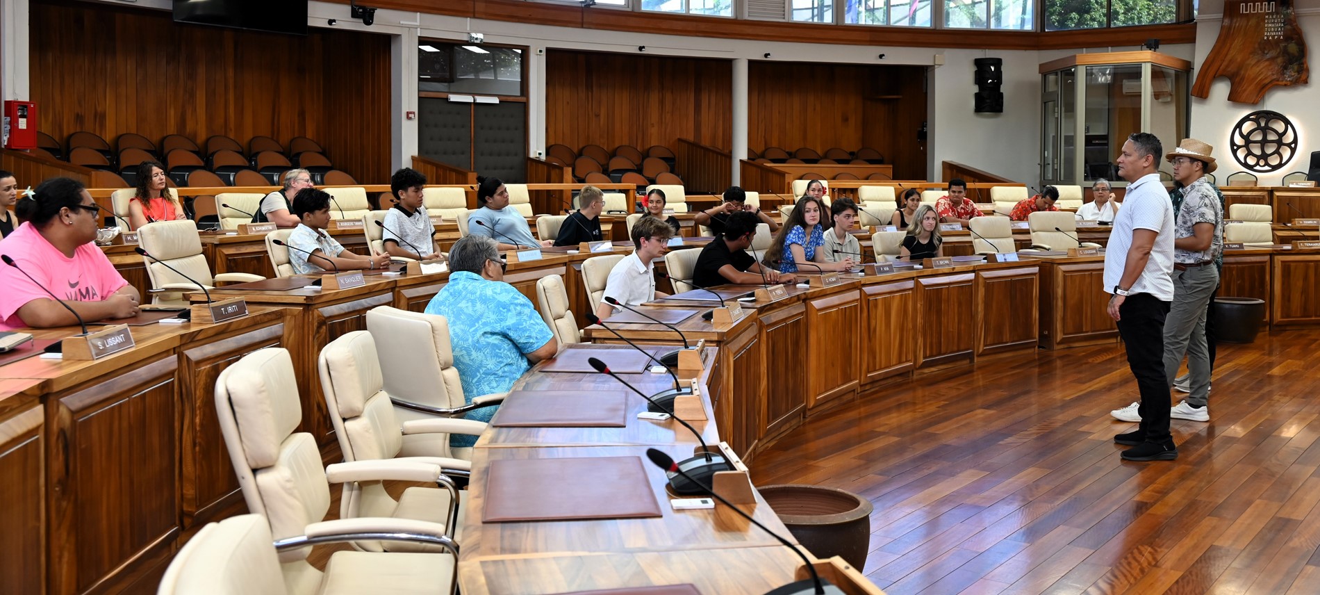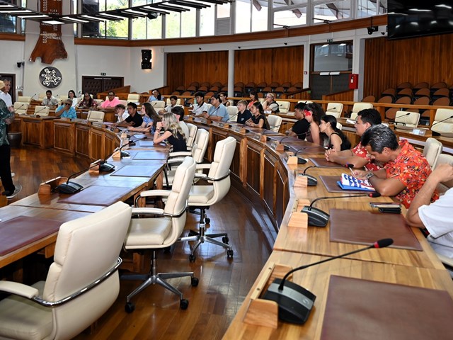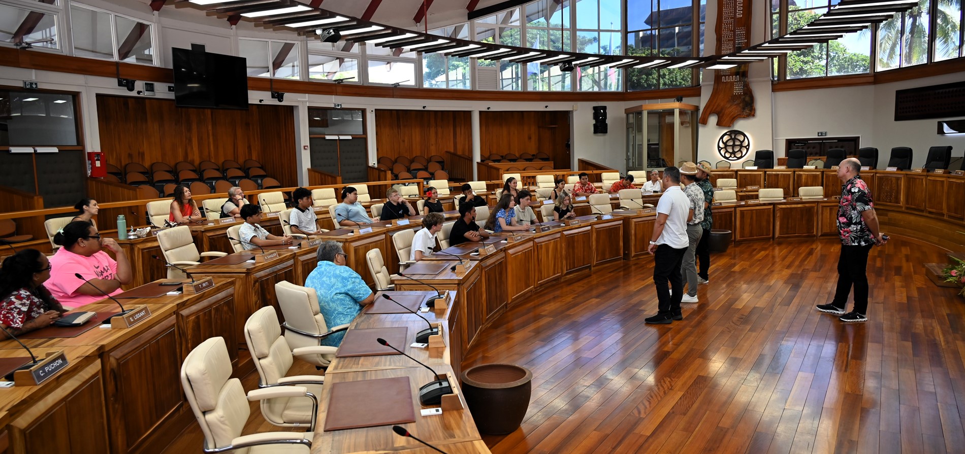 Les visiteurs ont ensuite été initiés au parcours des textes étudiés en salle des commissions, puis adoptés en salle des séances Vetea BAMBRIDGE. Le groupe a ainsi pu mesurer l’importance du rôle des représentants des cinq archipels au cours de leur mandature.