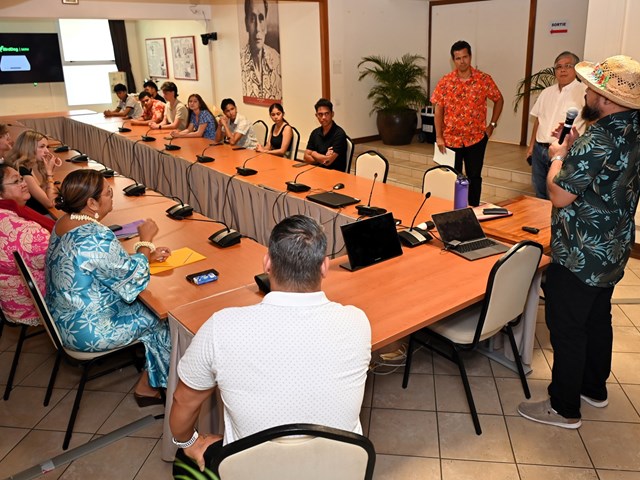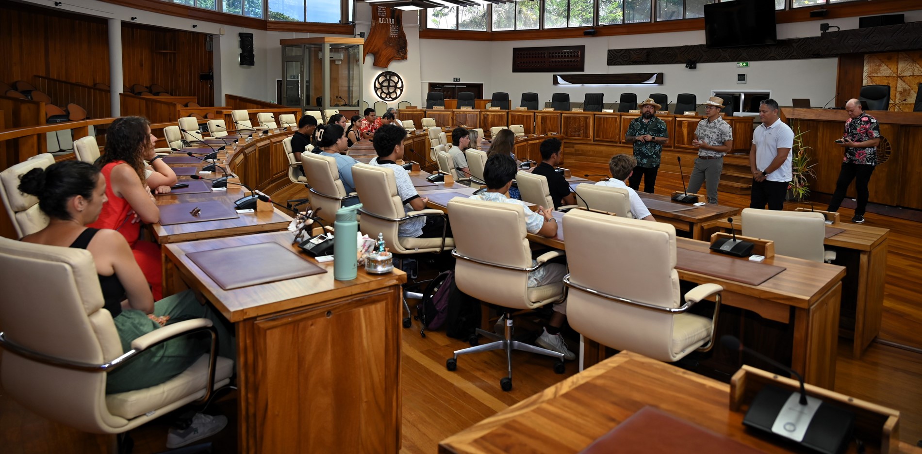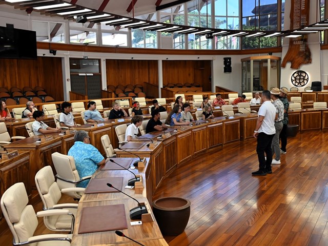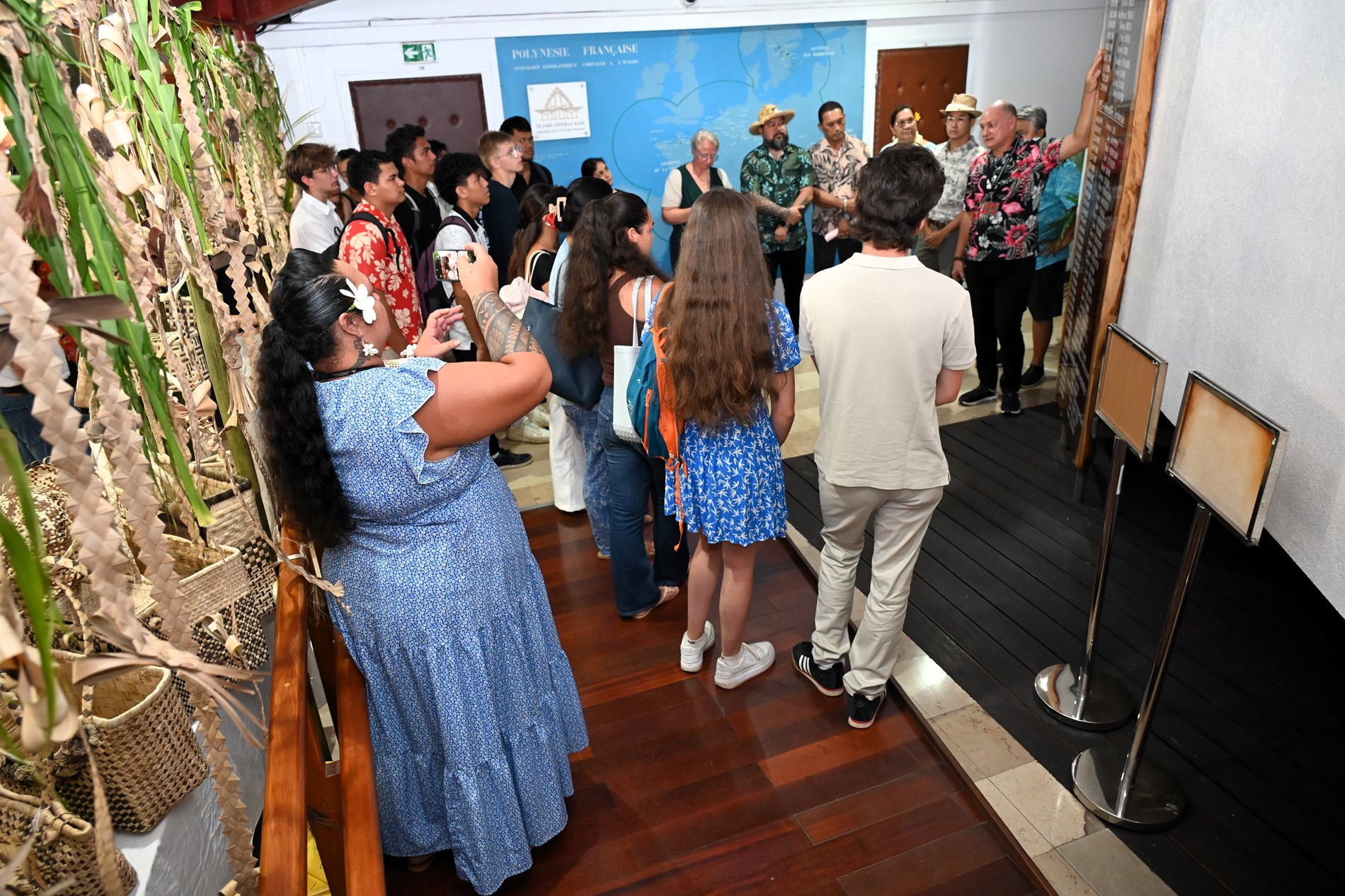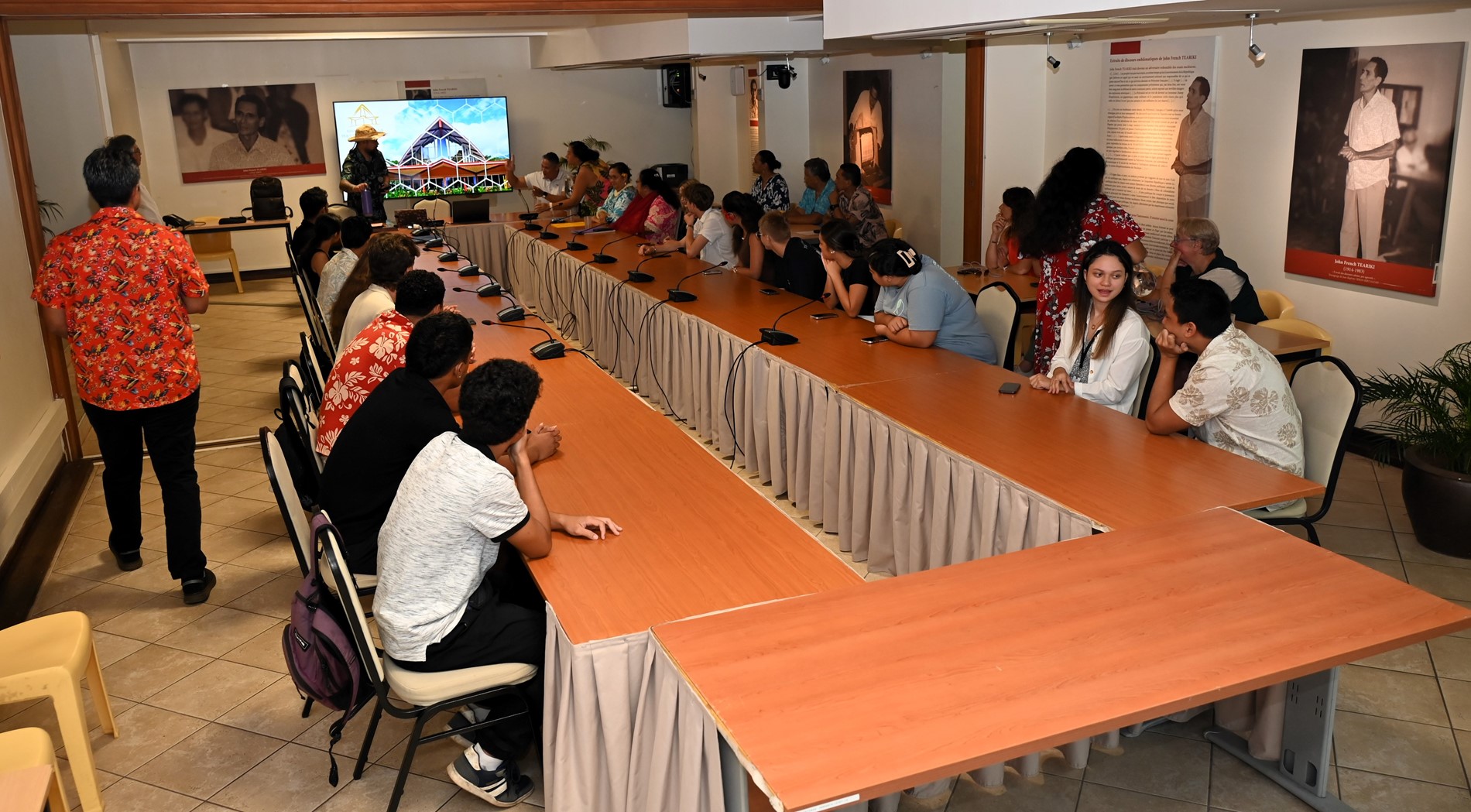 Les visiteurs ont ensuite été initiés au parcours des textes étudiés en salle des commissions, puis adoptés en salle des séances Vetea BAMBRIDGE. Le groupe a ainsi pu mesurer l’importance du rôle des représentants des cinq archipels au cours de leur mandature.