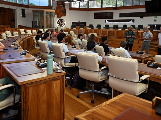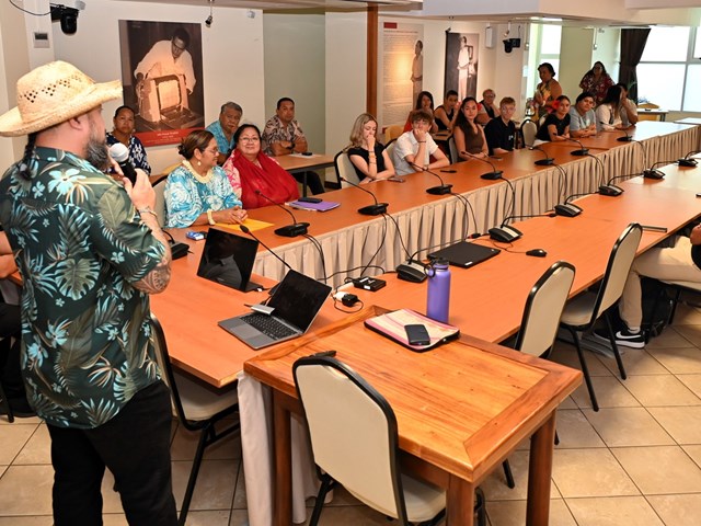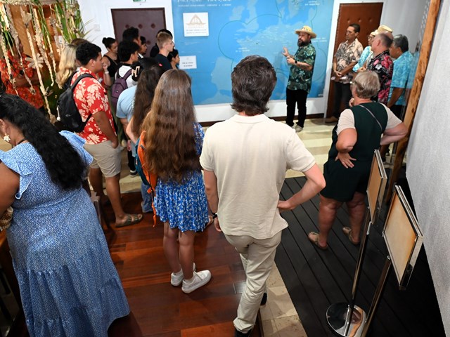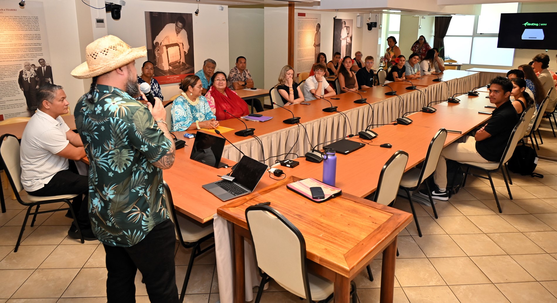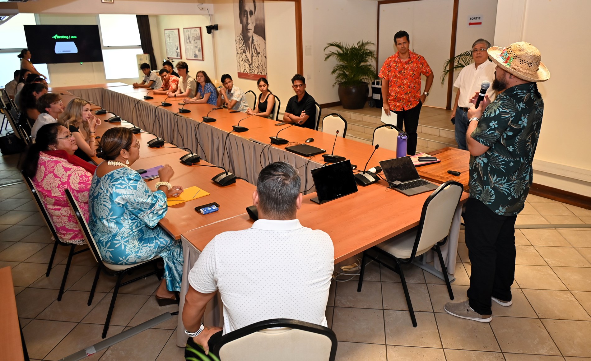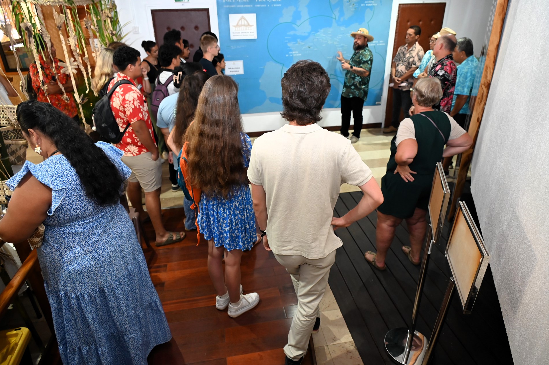 Les visiteurs ont ensuite été initiés au parcours des textes étudiés en salle des commissions, puis adoptés en salle des séances Vetea BAMBRIDGE. Le groupe a ainsi pu mesurer l’importance du rôle des représentants des cinq archipels au cours de leur mandature.