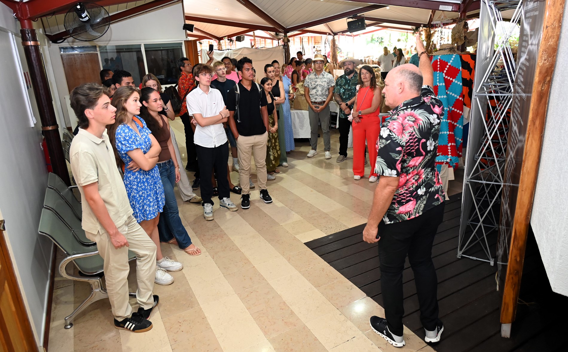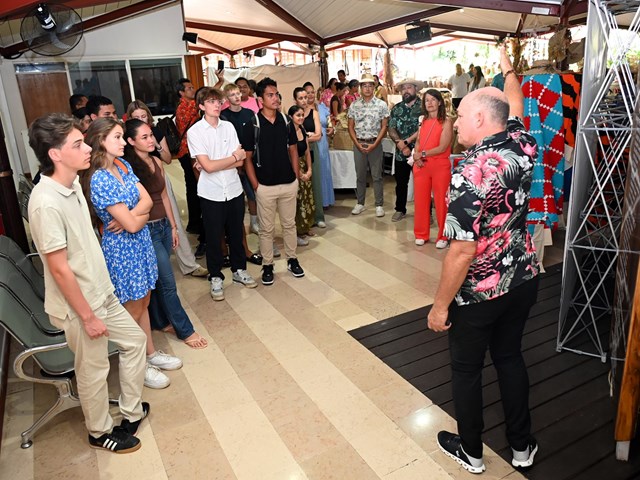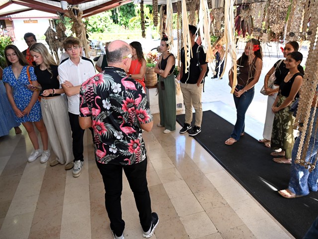 En présence de M. Tevaipaea HOIORE, président de la commission de l'éducation, de la jeunesse et des sports, et de plusieurs représentants, la visite a débuté dans le hall René LEBOUCHER où se tient la 5e édition de l’exposition artisanale Va'ine rima'i no Rurutu noa, jusqu’au 10 mai.