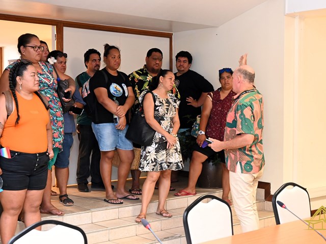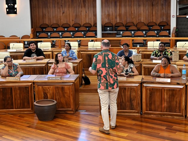 Les stagiaires se sont ensuite dirigés vers la salle John French TEARIKI, portant le nom d’un ancien président de l’Assemblée. Cette deuxième salle des commissions accueille les représentants membres des commissions législatives ainsi que diverses réunions en relation avec le travail délibératif.