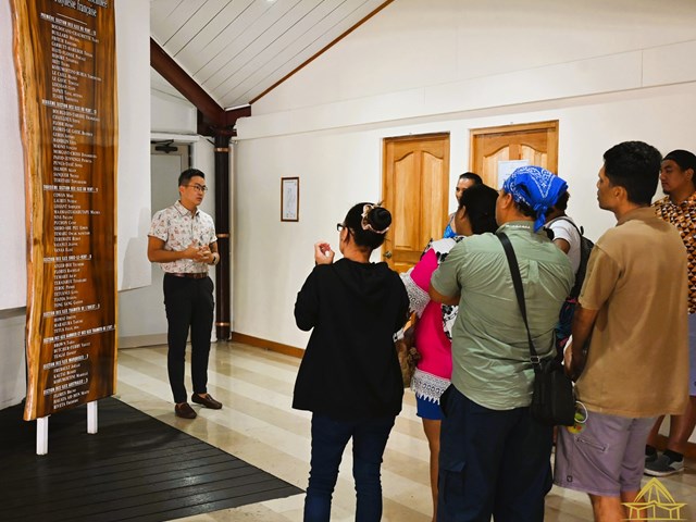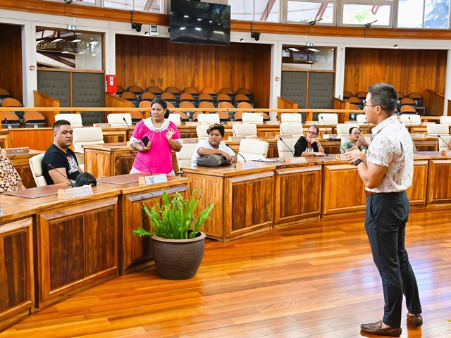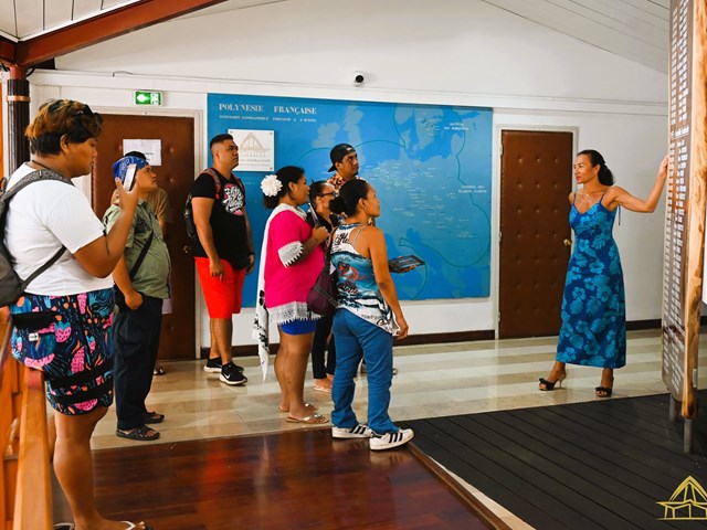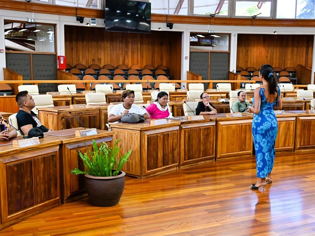Ensuite, ils ont exploré l’hémicycle Vetea Bambridge, où ils ont appris le rôle et le fonctionnement de l’institution ainsi que les différents symboles présents dans la salle des séances. Ils ont pu s'asseoir à la place des représentants et découvrir les œuvres sculptées qui mettent en valeur les cinq archipels de la Polynésie.