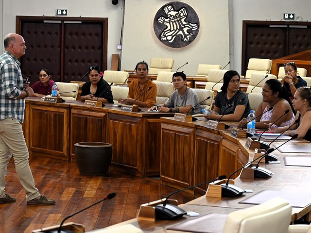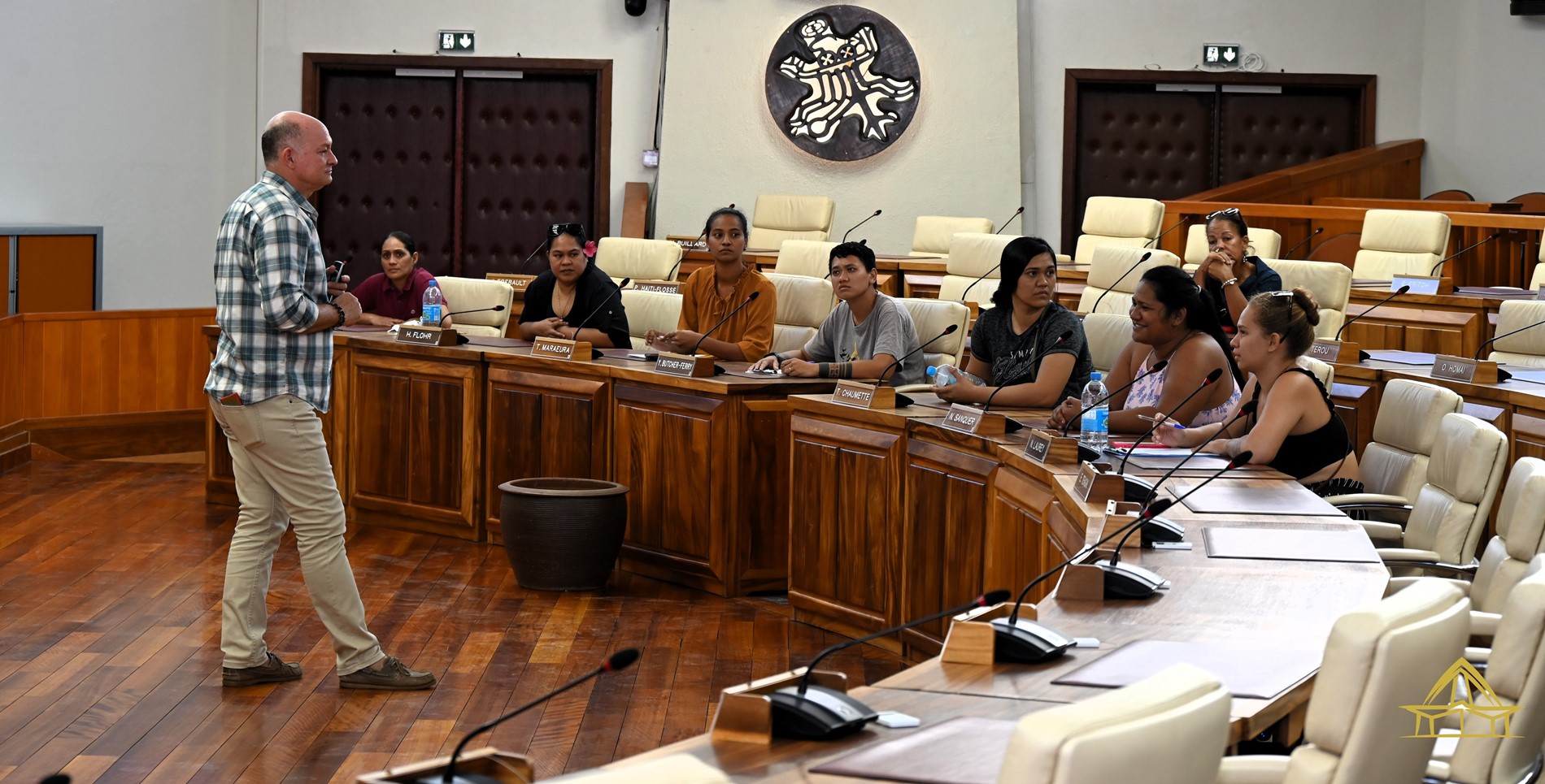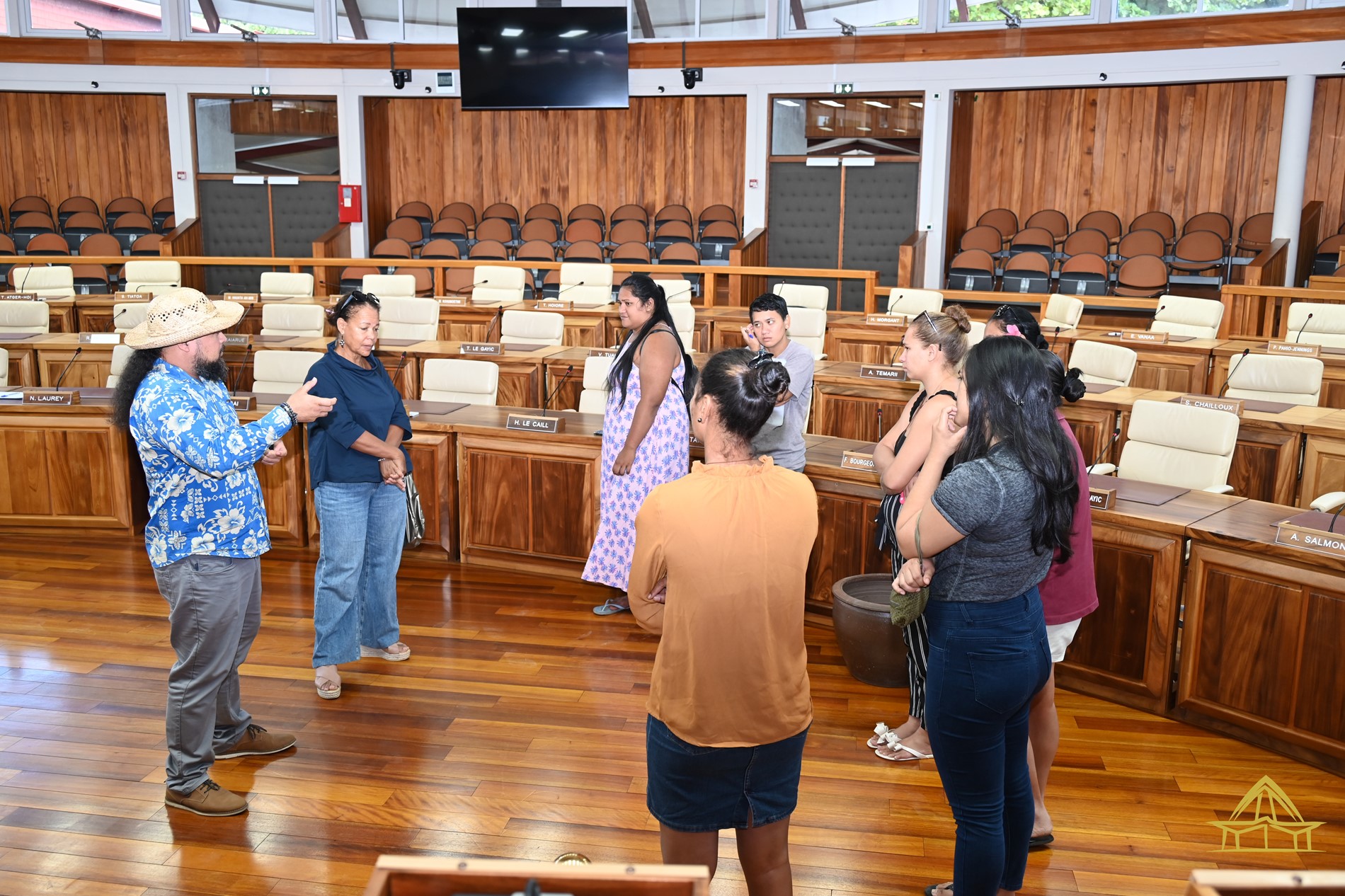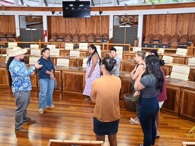 Puis, ils ont exploré l’hémicycle Vetea Bambridge, où ils ont appris le rôle et le fonctionnement de l’institution ainsi que les différents symboles présents dans la salle des séances. Ils ont pu s'asseoir à la place des représentants et découvrir les œuvres sculptées qui mettent en valeur les cinq archipels de la Polynésie.