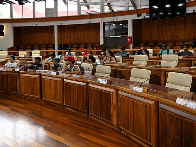Ce vendredi 3 octobre 2025, 15 élèves en classe de 3e prépa-métiers du Collège de Pao Pao à Moorea, accompagnés de leurs 3 encadrants, ont visité l’Assemblée de la Polynésie française dans le cadre d’un projet de découverte des institutions.