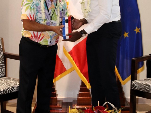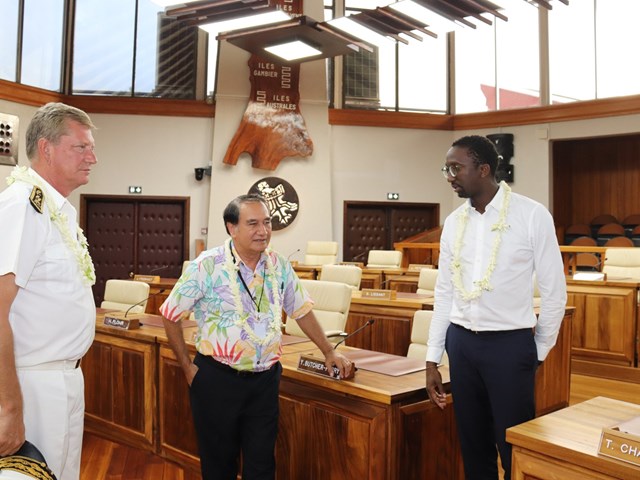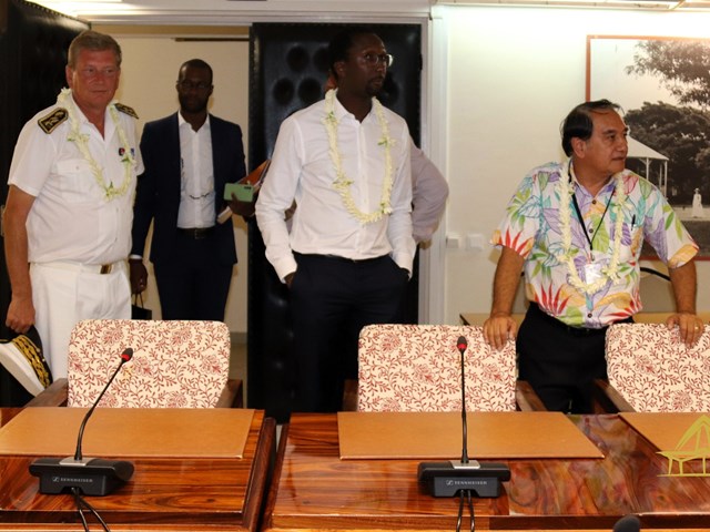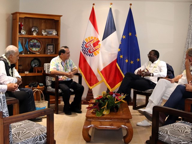 M. Antony GEROS, président de l’assemblée de la Polynésie française, accompagné de M. Oscar TEMARU, président du groupe Tavini huiraatira à l’assemblée, a reçu ce lundi 13 novembre 2023 dans le cadre d’une visite protocolaire, M. Hervé BERVILLE, secrétaire d'État auprès de la Première Ministre, chargé de la mer, ainsi que M. Eric SPITZ, haut-commissaire de la République en Polynésie française.
