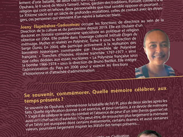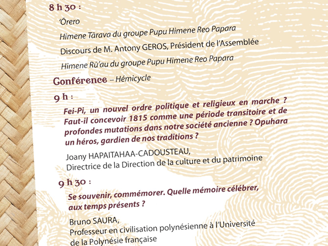 La cérémonie d’ouverture, se tiendra dans les jardins de la Reine Pomare IV à partir de 8h30. Puis la matinée se poursuivra dans l’hémicycle pour une conférence, avec deux interventions : Mme Joany HAPAITAHAA-CADOUSTEAU, sur le thème « Fei-Pi, un nouvel ordre politique et religieux en marche ? Faut-il concevoir 1815, comme une période transitoire et de profondes mutations dans notre société ancienne ? ‘Opuhara un héros, gardien de nos traditions ?» et M. Bruno SAURA, sur le thème « Se souvenir, commémorer. Quelle mémoire célébrer, aux temps présents ? », suivies d’un temps d’échange avec le public.