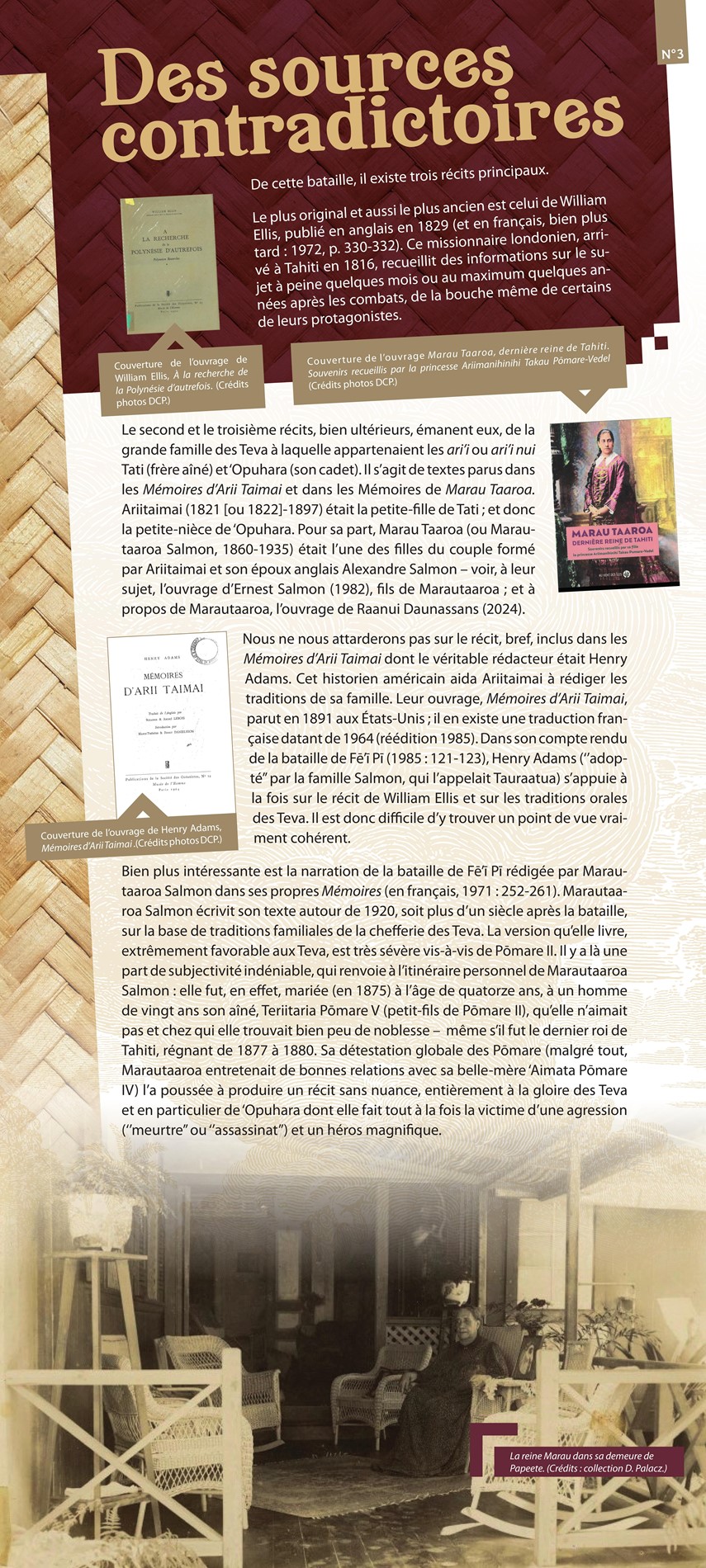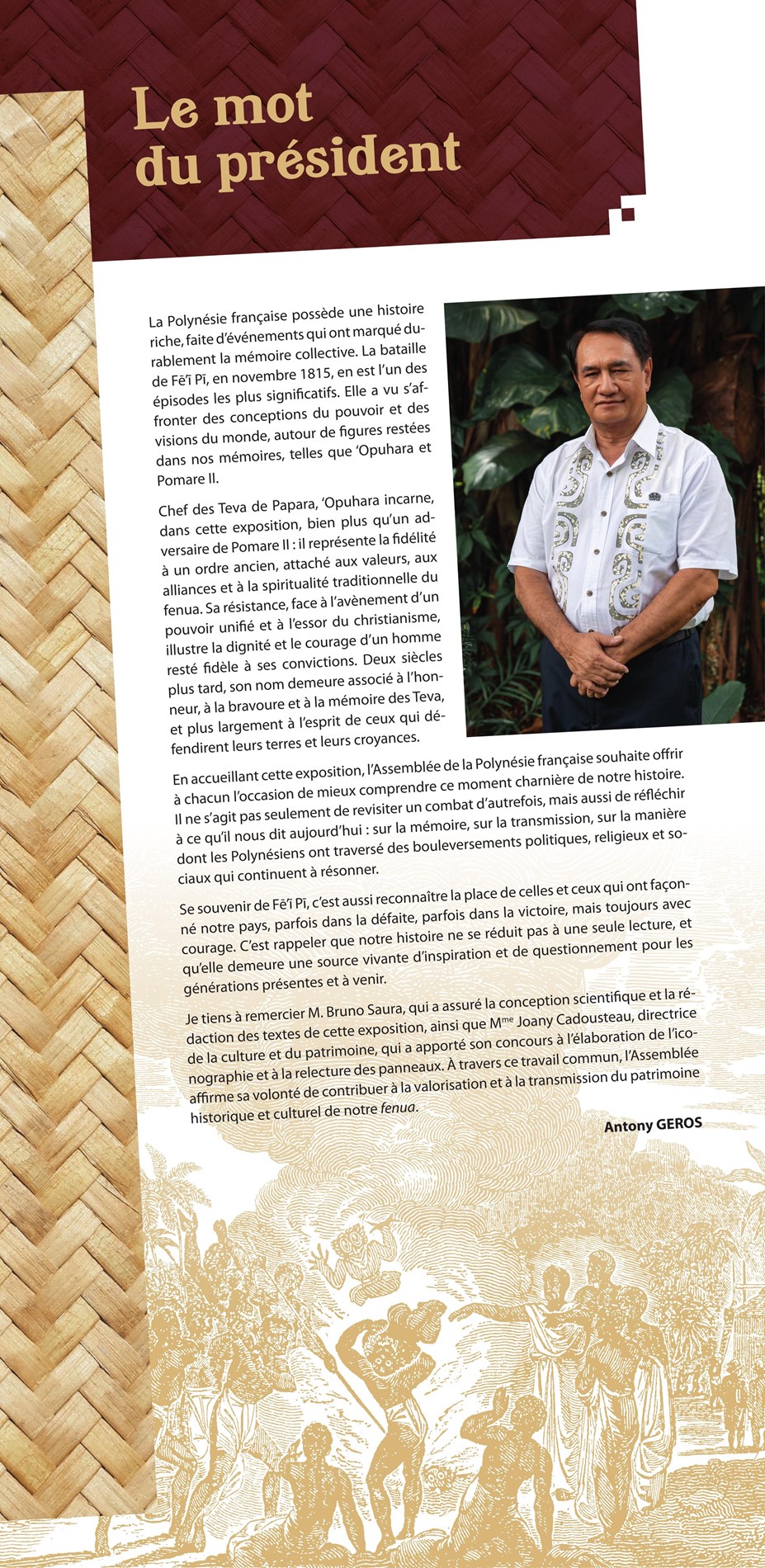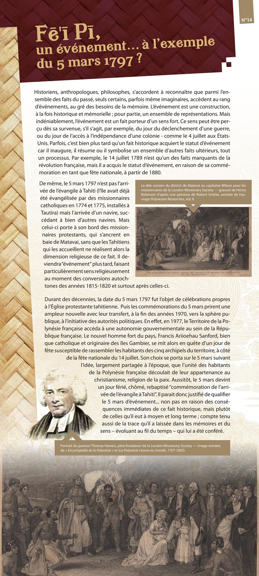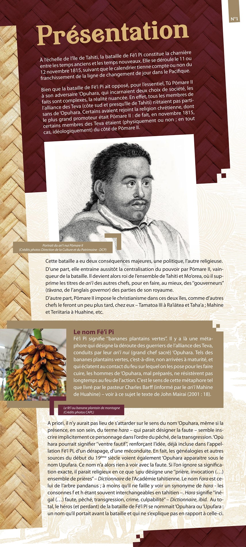 Fei-Pi, Opuhara, Pomare autant de noms qui évoquent une période particulière, celle d’une transition politique mais aussi religieuse. 1815 ? Une période qui marquerait la fin de nos traditions, le début d’un nouvel ordre. Autant de questions auxquelles nous tâcherons de répondre lors de cette intervention. Entre témoignages écrits et études de terrain, les sources ne manquent pas pour évoquer la bataille dite de Fei-Pi. S’agit-il réellement d’une bataille, de deux clans qui s’opposent celui des Teva et des Te Porionuu. Opuhara, le ti sacré de Mou’a Tamaiti, héros, gardien des traditions, Pomare, converti à la religion qui croit en Iehova, deux personnalités que tout semble opposé et pourtant…. Le XIXème siècle est un siècle de profondes mutations, celles de contact avec les étrangers, ces personnes qui viennent d’un navire à balancier blanc.