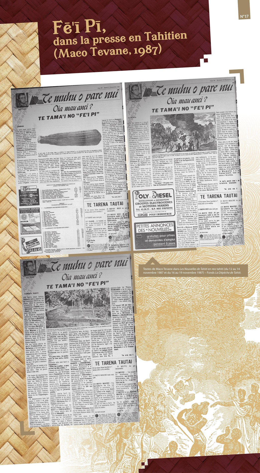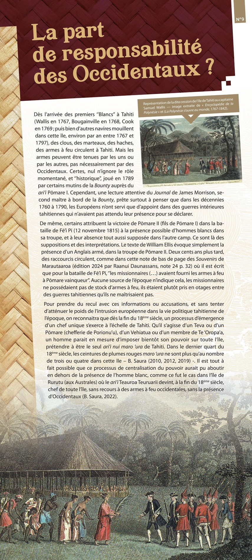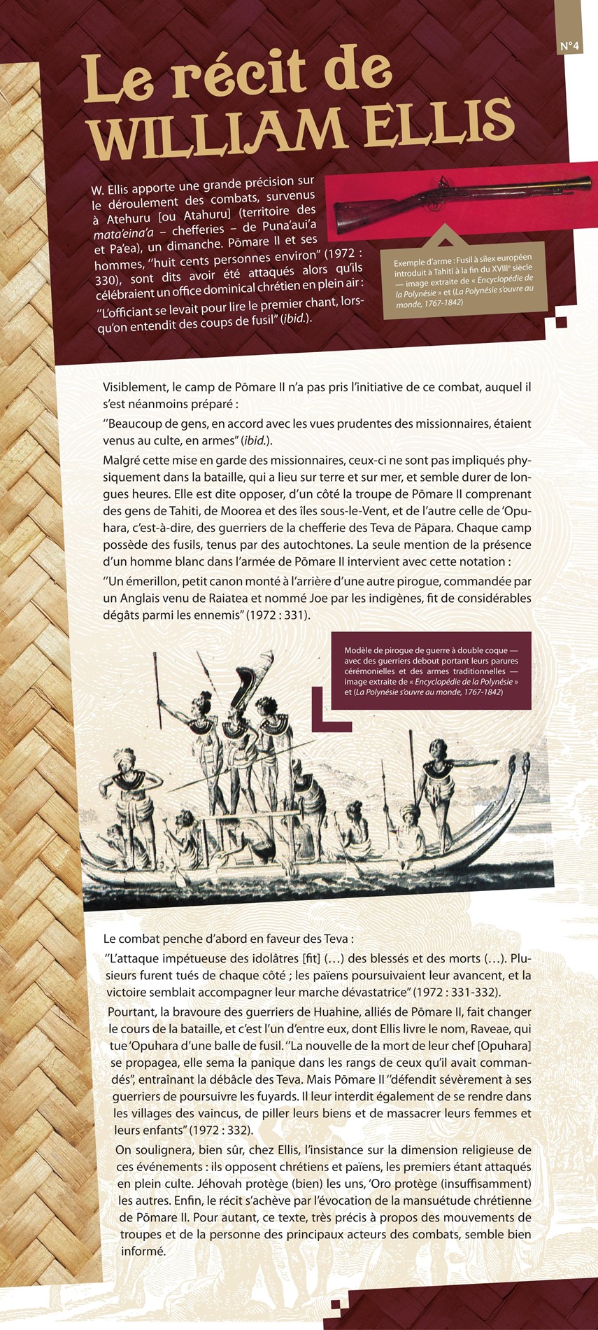 Fei-Pi, Opuhara, Pomare autant de noms qui évoquent une période particulière, celle d’une transition politique mais aussi religieuse. 1815 ? Une période qui marquerait la fin de nos traditions, le début d’un nouvel ordre. Autant de questions auxquelles nous tâcherons de répondre lors de cette intervention. Entre témoignages écrits et études de terrain, les sources ne manquent pas pour évoquer la bataille dite de Fei-Pi. S’agit-il réellement d’une bataille, de deux clans qui s’opposent celui des Teva et des Te Porionuu. Opuhara, le ti sacré de Mou’a Tamaiti, héros, gardien des traditions, Pomare, converti à la religion qui croit en Iehova, deux personnalités que tout semble opposé et pourtant…. Le XIXème siècle est un siècle de profondes mutations, celles de contact avec les étrangers, ces personnes qui viennent d’un navire à balancier blanc.